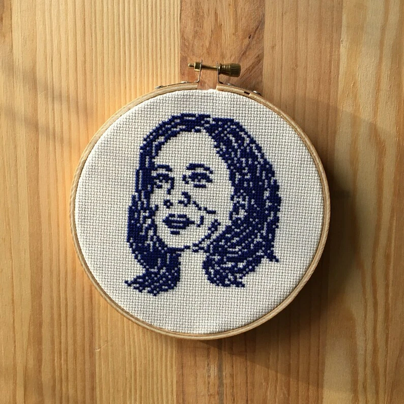 Handmade Materials: zweigart fabric, basketweave fabric, tapestry needle, finishing instructions, embroidery hoop, grid pattern Create your own counted cross-stitch portrait of Kamala Harris. Each kit includes Zweigart cross-stitch fabric, a 5-inch wooden embroidery hoop, one tapestry needle, a grid pattern, 6-strand embroidery floss, and instructions for cross-stitching and finishing the project. The embroidery floss is blue. It takes about 3-6 hours to complete this project, depending on your experience with counted cross-stitch. Please note that this is a COUNTED CROSS-STITCH project. The fabric included in the kit is blank.