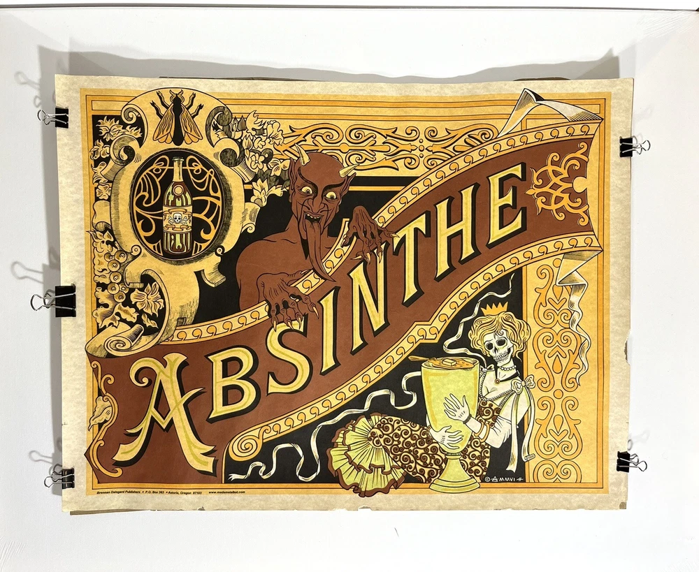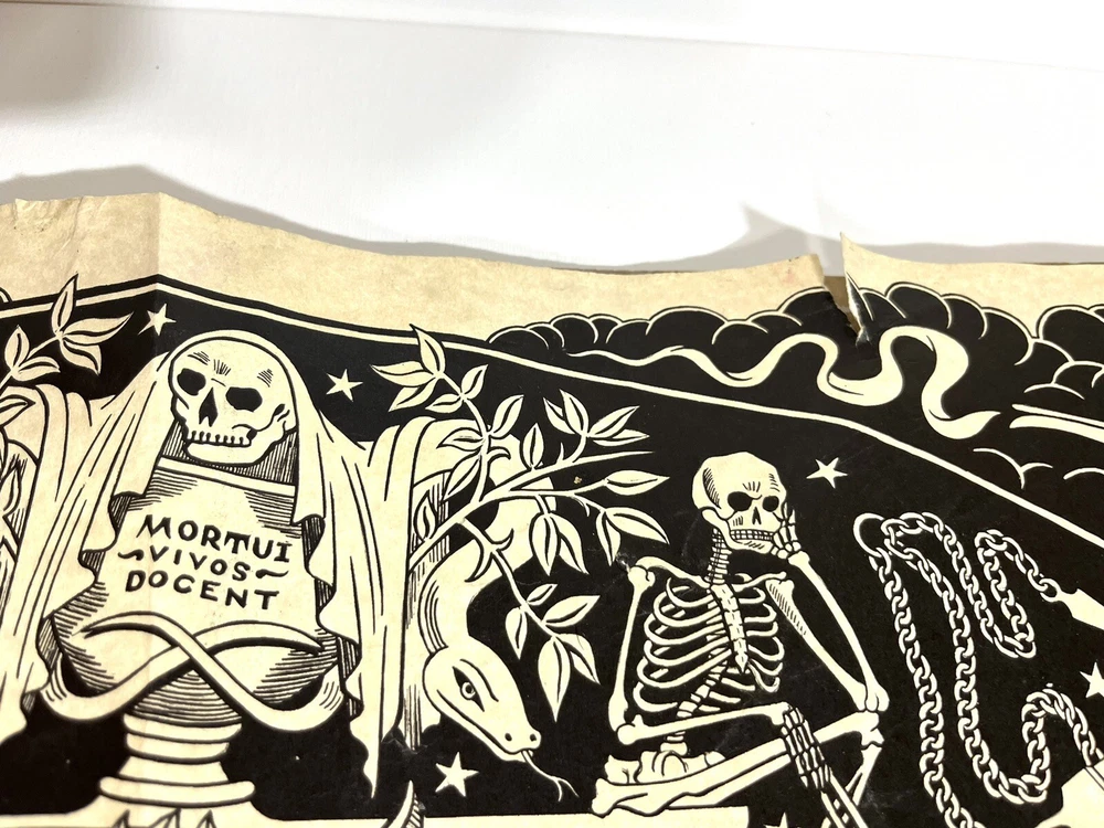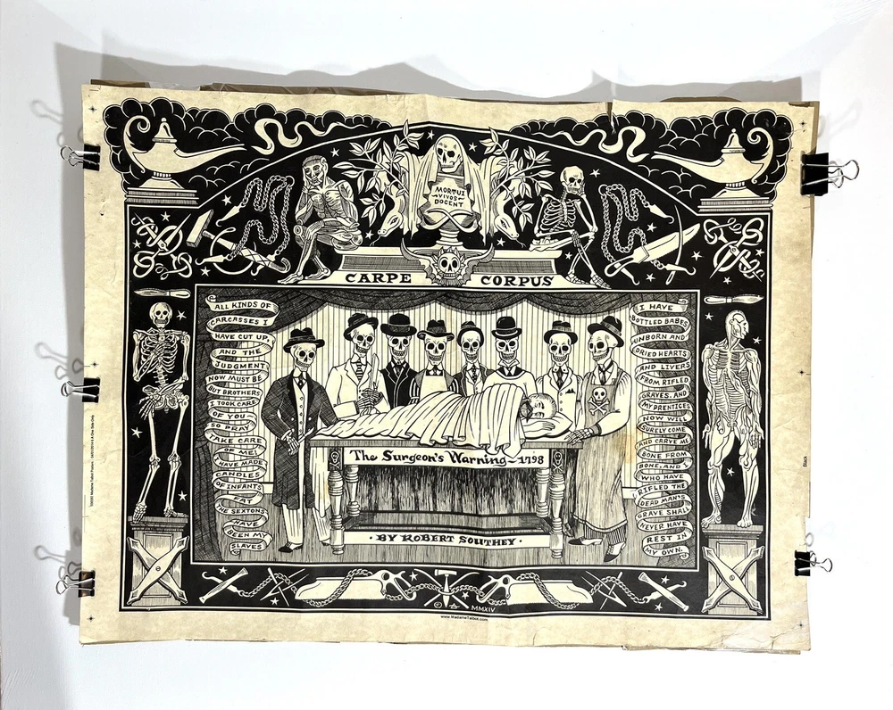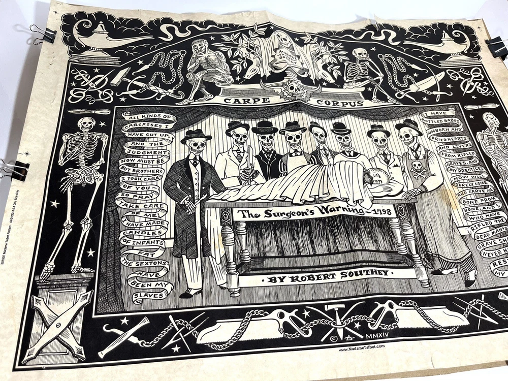 Madam Talbot Skeleton Posters. set of 5. See all pictures. This set of 5 vintage Madam Talbot posters is a must-have for any lover of Gothic style and Victorian lowbrow art. The posters feature skeletons in various poses and are printed on high-quality paper in size 23"x17.5". They are licensed reprints from the original set, produced in the 1990s in Washington, USA. The posters are unframed and sold as a set, making them a great addition to any art collection. The artist, Madame Talbot, is known for her unique and captivating designs that blend Gothic themes with Victorian lowbrow style. Don't miss out on the opportunity to own this amazing set of posters! Two posters have defects