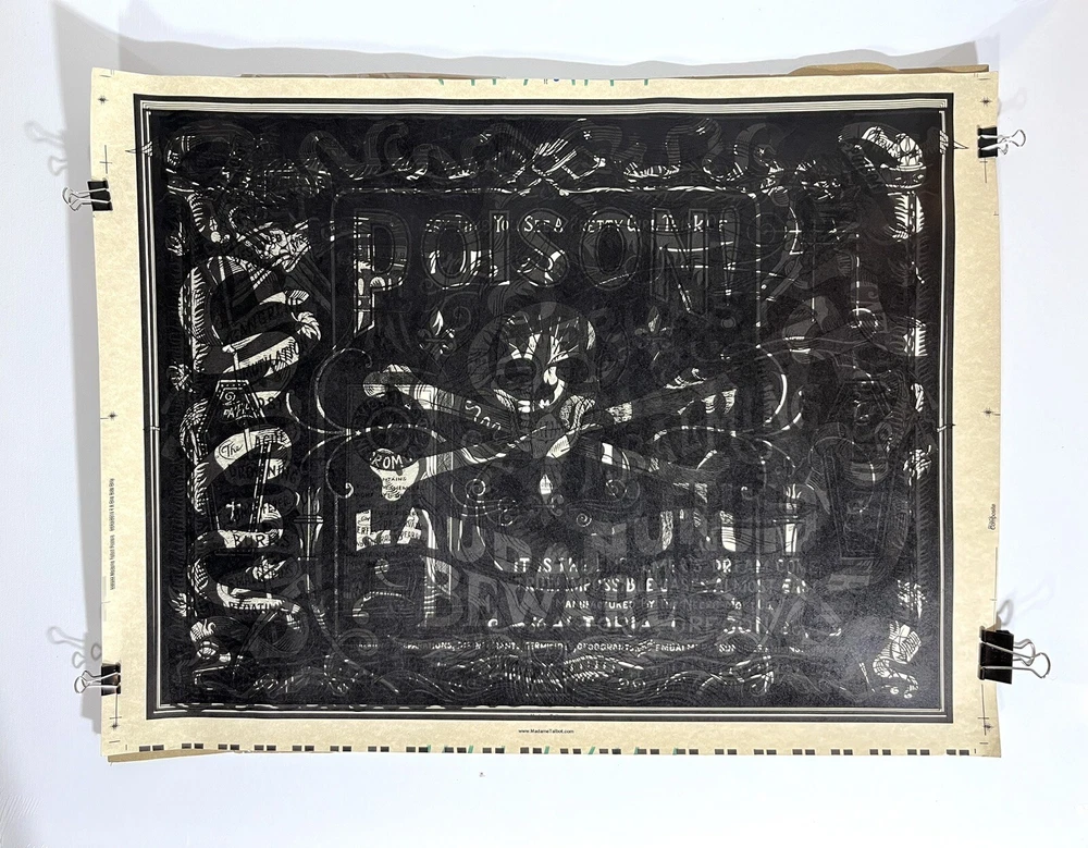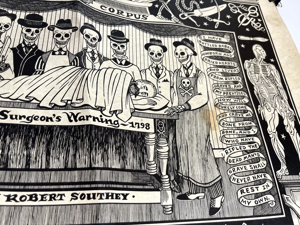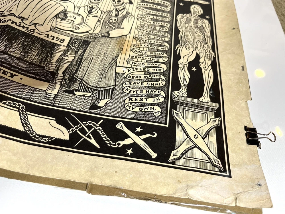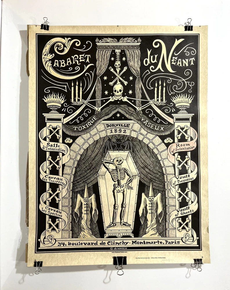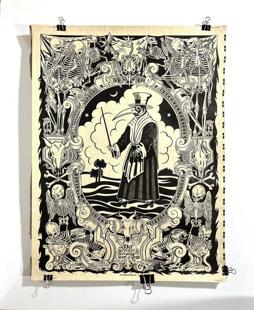 Madam Talbot Skeleton Posters. set of 5. See all pictures. This set of 5 vintage Madam Talbot posters is a must-have for any lover of Gothic style and Victorian lowbrow art. The posters feature skeletons in various poses and are printed on high-quality paper in size 23"x17.5". They are licensed reprints from the original set, produced in the 1990s in Washington, USA. The posters are unframed and sold as a set, making them a great addition to any art collection. The artist, Madame Talbot, is known for her unique and captivating designs that blend Gothic themes with Victorian lowbrow style. Don't miss out on the opportunity to own this amazing set of posters! Two posters have defects