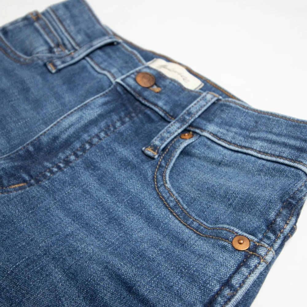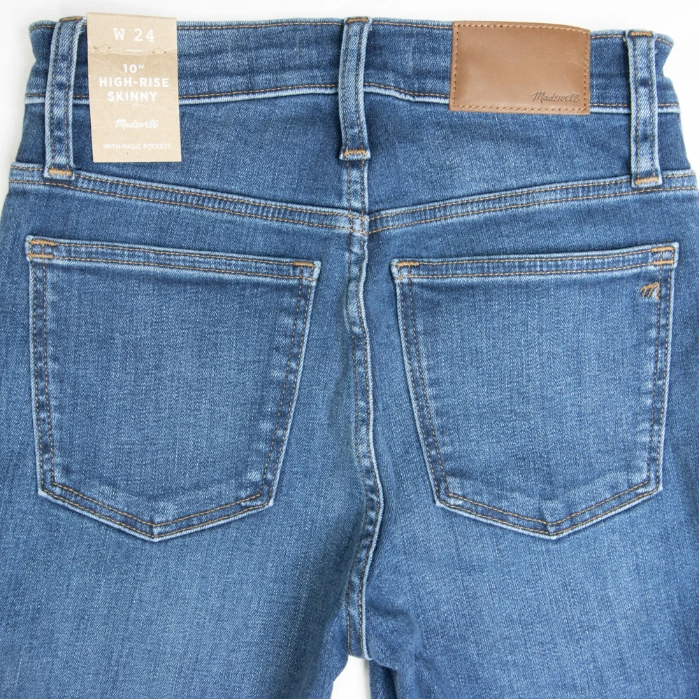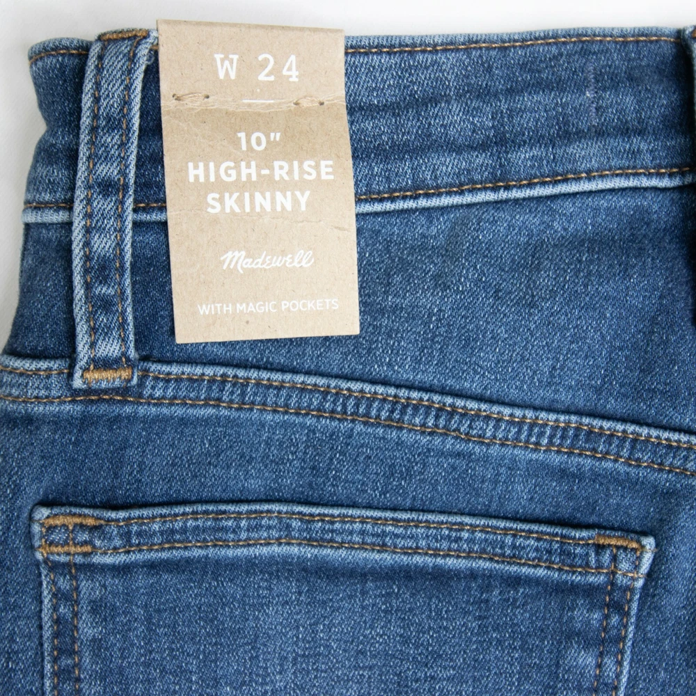 Madewell 10" High-Rise Skinny Jeans in Bradshaw Wash, size regular 24, MB909. Condition is "New with tags". Shipped with USPS Priority Mail. Super stretch, etra etra comfy. Made from premium holds-you-in denim, our 10" high-rise skinny jeans are lean and legs-for-days sexy. Approx. measurements: 12 3/4'' laid flat waist; 9.5" high rise, fitted through the hip and thigh, with a 9 3/4" skinny leg opening, 28" inseam. Premium 97% organic cotton/3% Eco-Smart® recycled elastane Candiani denim. Magic Pockets. Machine wash. Import. MB909.