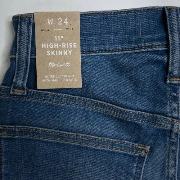 11" High-Rise Skinny Jeans in Layne Wash: TENCEL™ Denim Edition, size 24 Made of soft-to-the-touch denim woven with TENCEL™ lyocell, our 11" high-rise skinny jeans are lean and legs-for-days sexy. Approx. measurements: Laid flat waist: 12 1/2''. Inseam: 28''. High rise: 11". Fitted through the hip and thigh, with a 9 3/4" skinny leg opening. Premium 44% cotton/42% TENCEL™ lyocell/13% poly/1% elastane Orta denim. MB964 stretch, extra comfy
