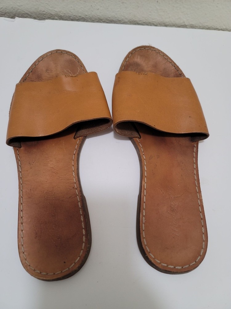These vintage leather slide sandals provide both style and comfort. Ideal for casual outfits, the handcrafted design showcases quality leather. The minimalist aesthetic complements various styles and occasions, while the durable sole ensures longevity. • Genuine leather construction • Slip-on design • Durable rubber sole • Comfortable footbed • Minimalist style CONDITIONS use, good conditions Visible wear on footbed and some scuffs. see photos for flaws details.