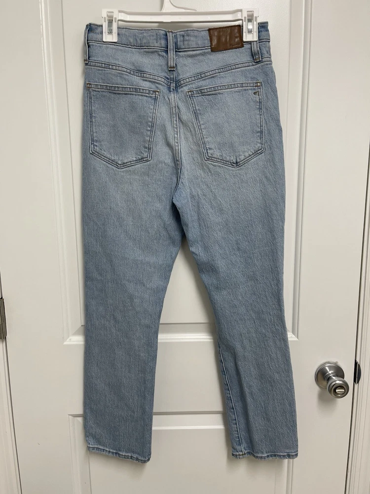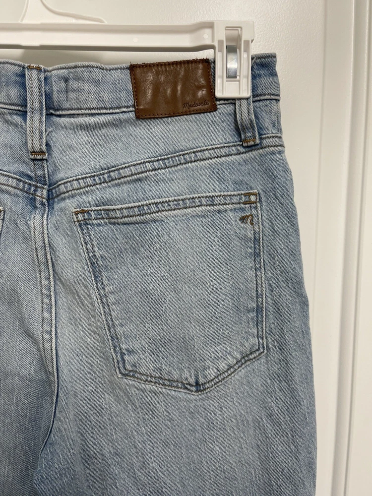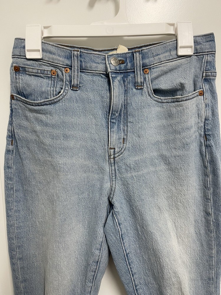 size: 26 color: light wash denim material: cotton and elastane high rise fit slight distressing at the knee slim fit cropped length estimated measurements 15 in waist 10.5 in rise 25 in inseam