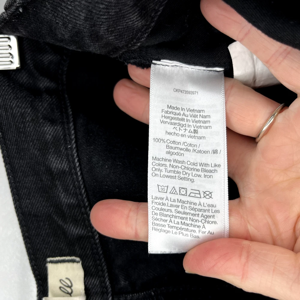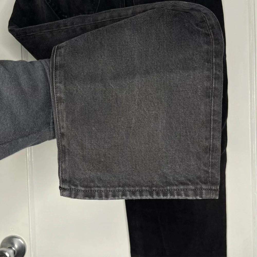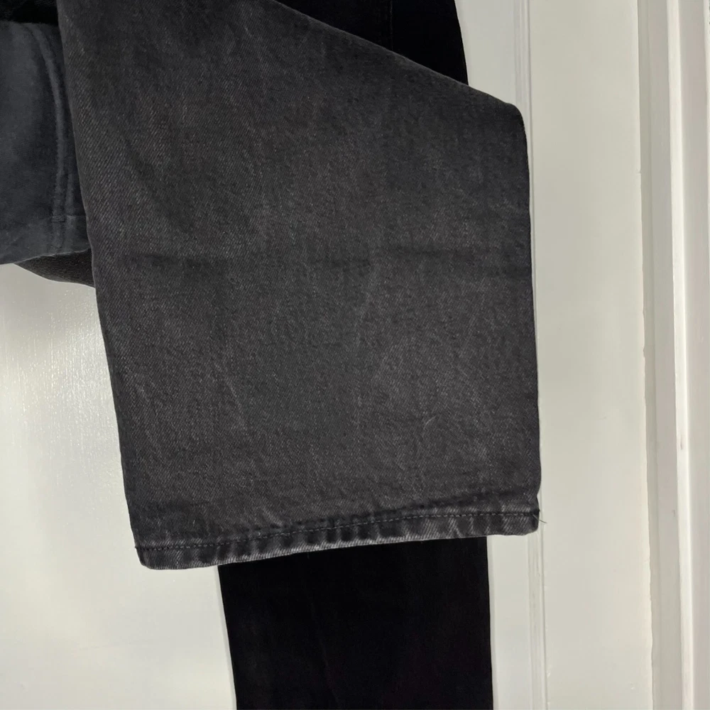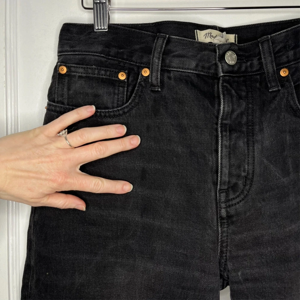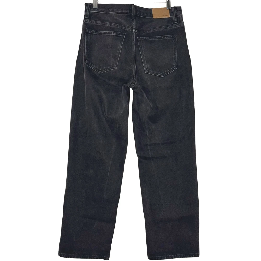 This is the Madewell Low Slung Straight jean in a size 26 and the Kent Wash faded black color. They are made of a loose woven 100% cotton denim fabric, feature a button fly and looser fit. Great Used Condition - Only flaw is 2 small stains near the right pocket (pictured). No other stains, holes, tears or other notable issues. Approximate Measurements: Length: 39" Rise: 11" Waist: 30" Inseam: 28" Leg Opening: 16" If you have any other questions or would like any additional measurements, please ask!