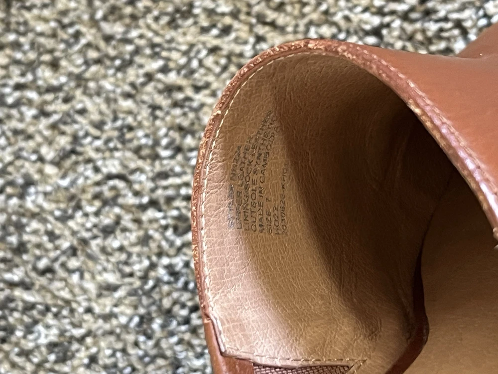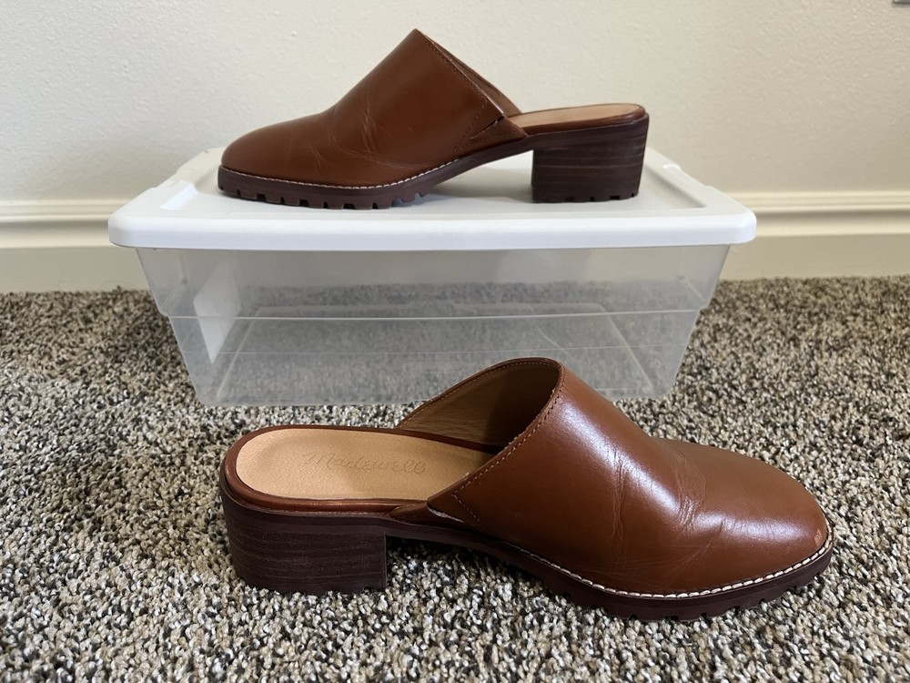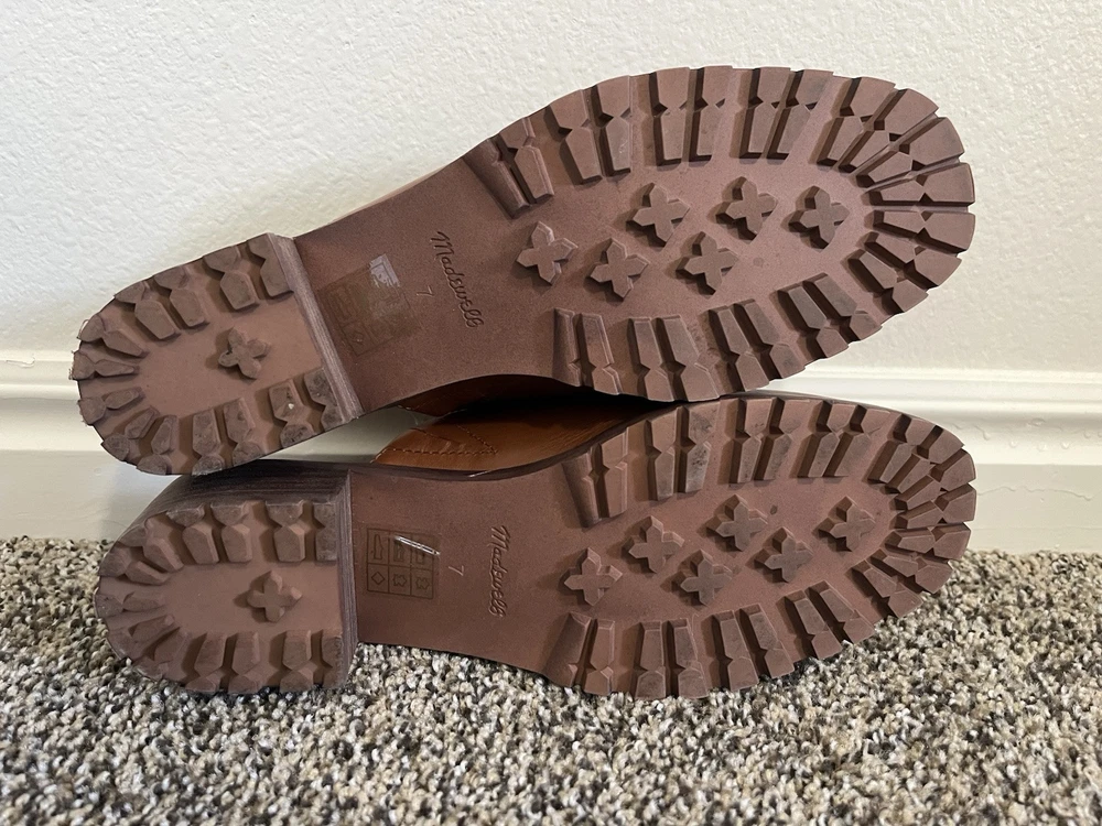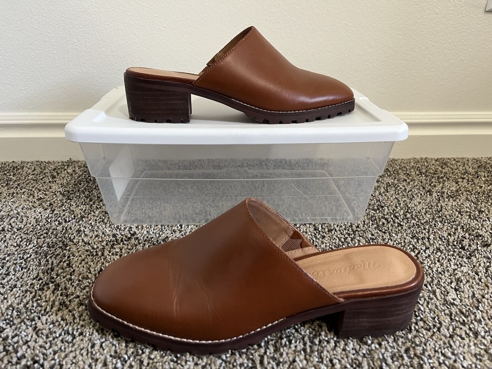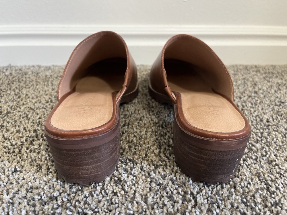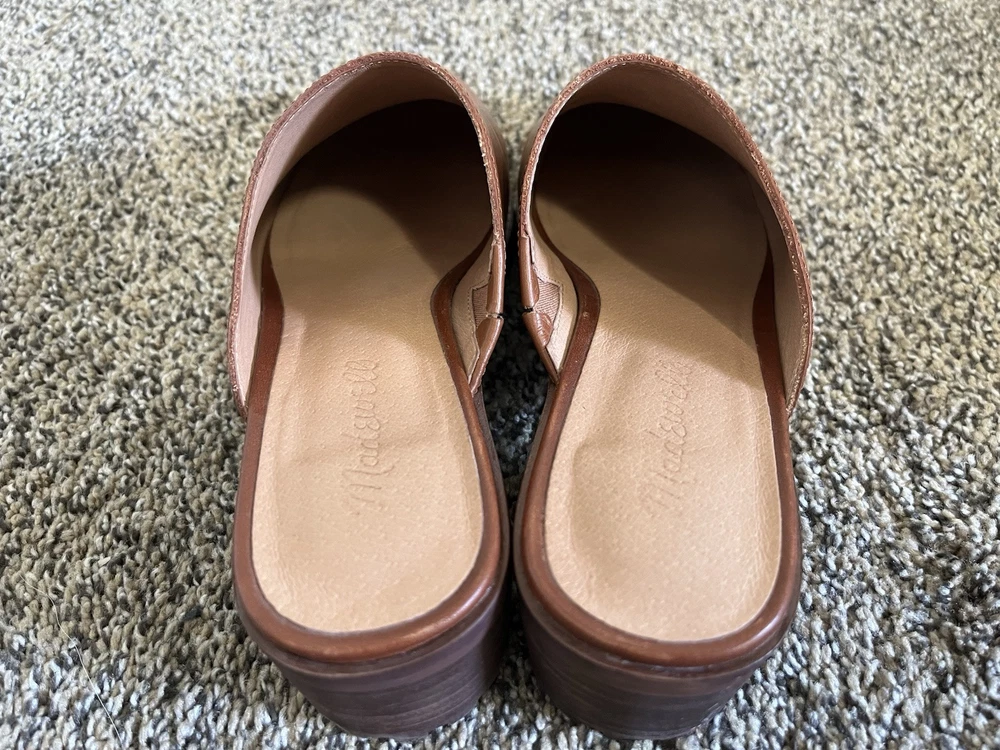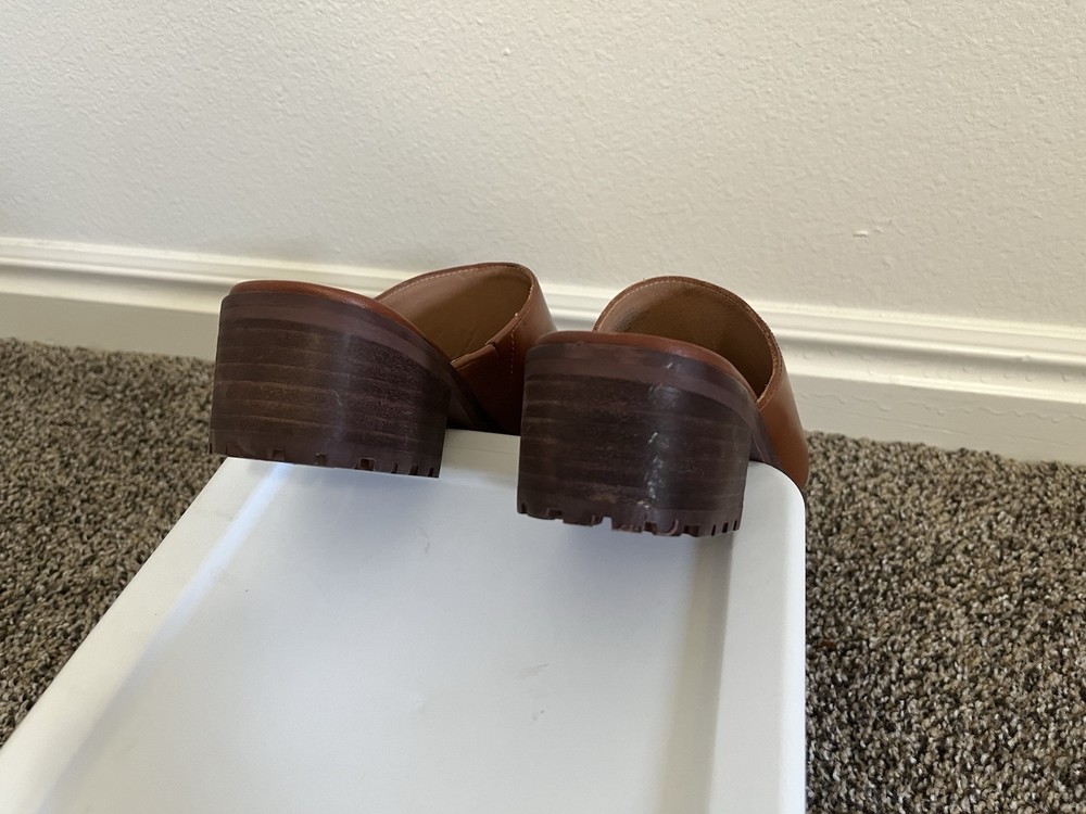 Madewell The Mindy Lugsole Mule in Leather ‘ Dried Maple ‘ Brown Women’s Size 7 Great condition! Does have some white scuff stains on the back of the right shoe. There is also a small scuff mark on the front tip of the left shoe. Details from Madewell: Crafted of smooth leather, this mule has a walkable stacked heel and durable lug sole. Comfy and easy, these are ideal to slip on with everything from jeans to dresses. And, cushiness alert: our MWL Cloudlift Lite padding feels like walking on a...well, you know. When you select your size, "H" equals a half size. 1 3/4" heel. Leather upper. Pigskin lining. Rubber sole. Do Well: leather sourced from a tannery that achieved a Gold Rating from the Leather Working Group (LWG), an organization that works to promote sustainable environmental practices in the leather industry. Import.