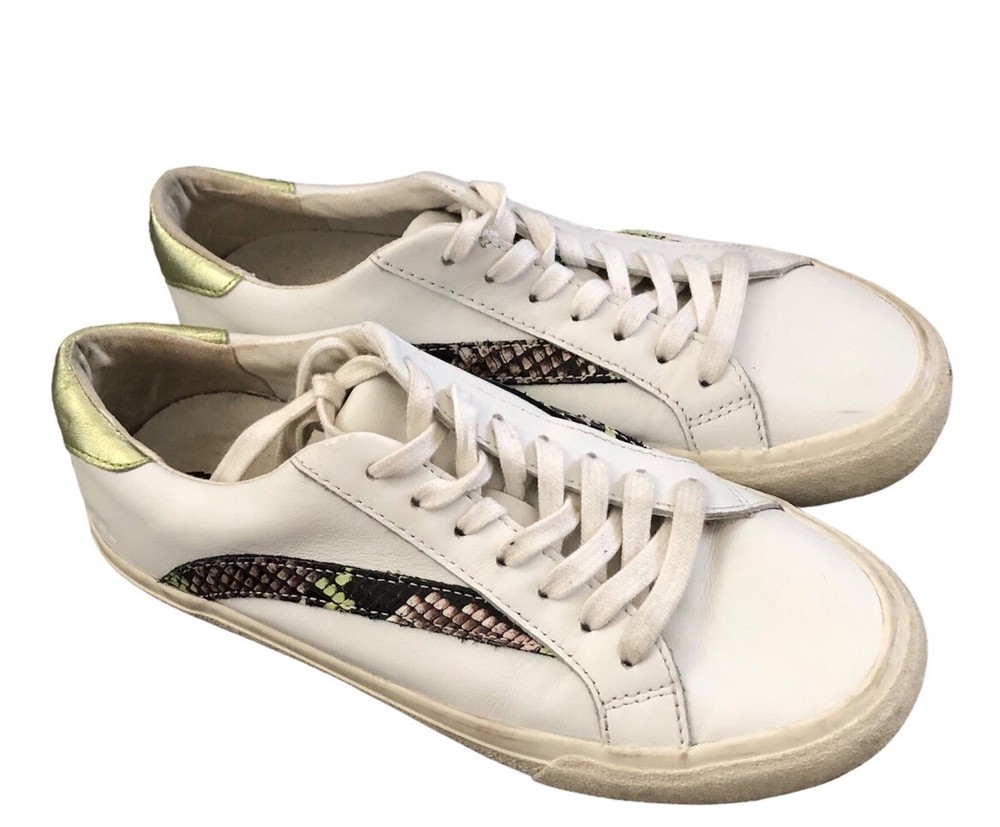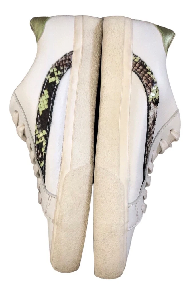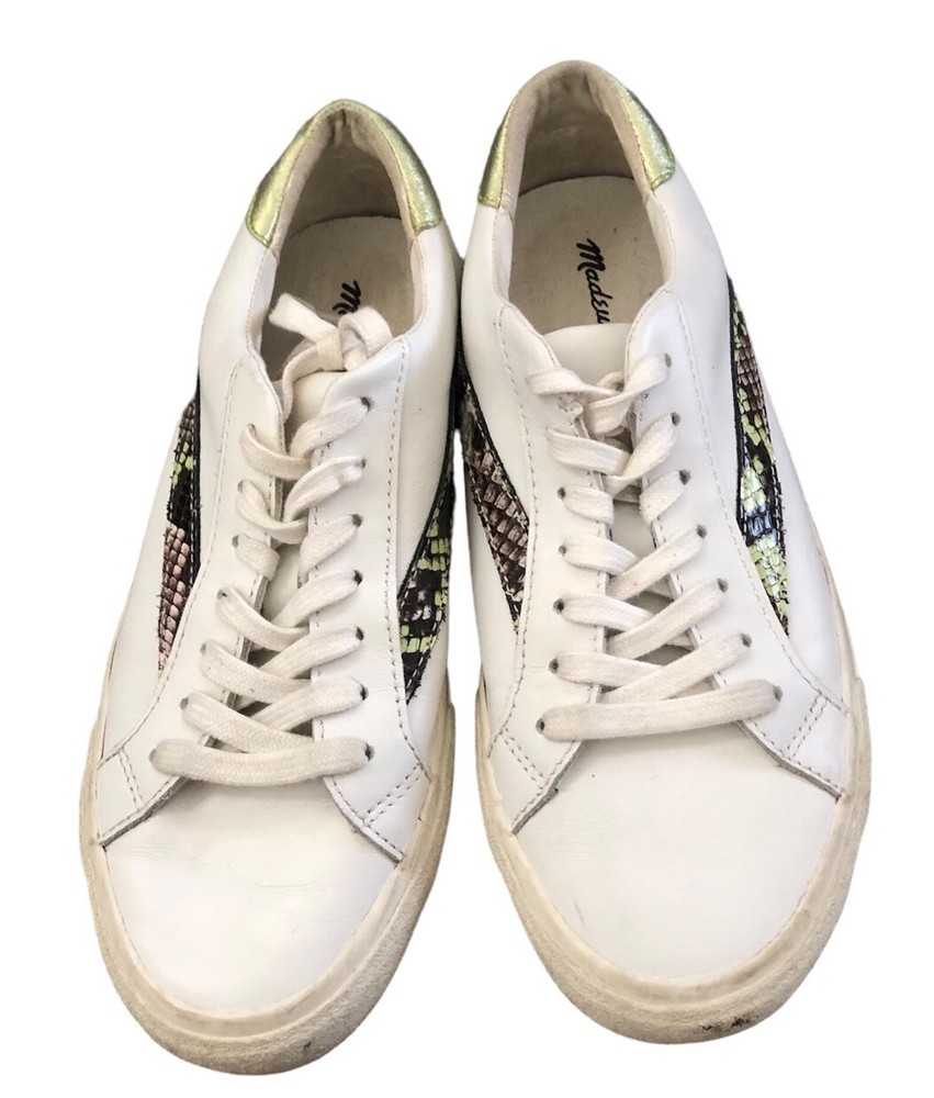 Elevate your sneaker game with these Madewell Sidewalk Snake Embossed sneakers. The white leather upper features a stylish colorblock pattern with snake-themed detailing. Lace-up closure ensures a secure fit while the low top design provides freedom of movement. These sneakers are perfect for any casual occasion and are sure to turn heads. The size 7.5 US sneakers have a medium width and are made with high-quality leather materials. The Madewell brand is known for their unique and fashionable designs, and these sneakers are no exception. Whether you're running errands or hanging out with friends, these sneakers will keep you comfortable and stylish. Preowned. Minor signs of wear.