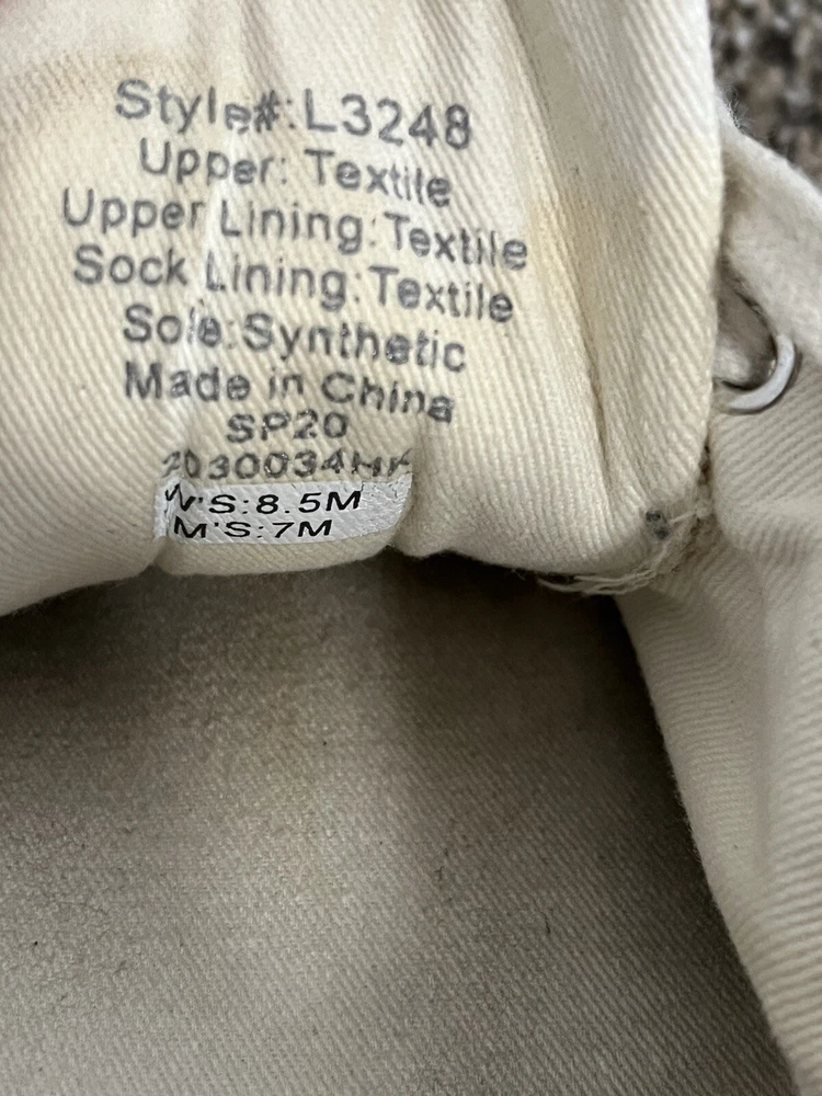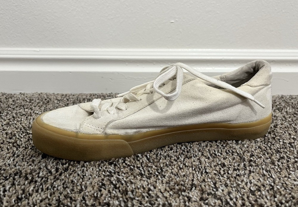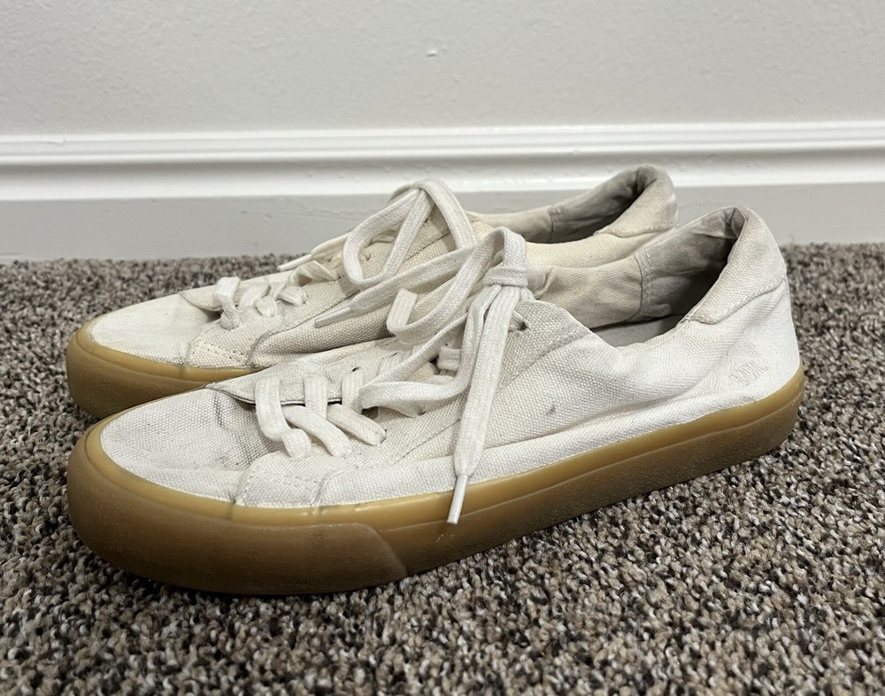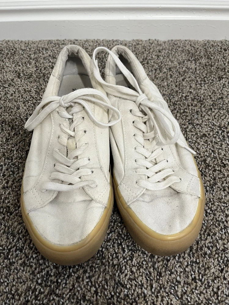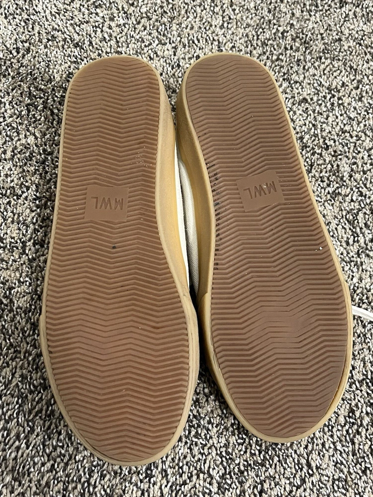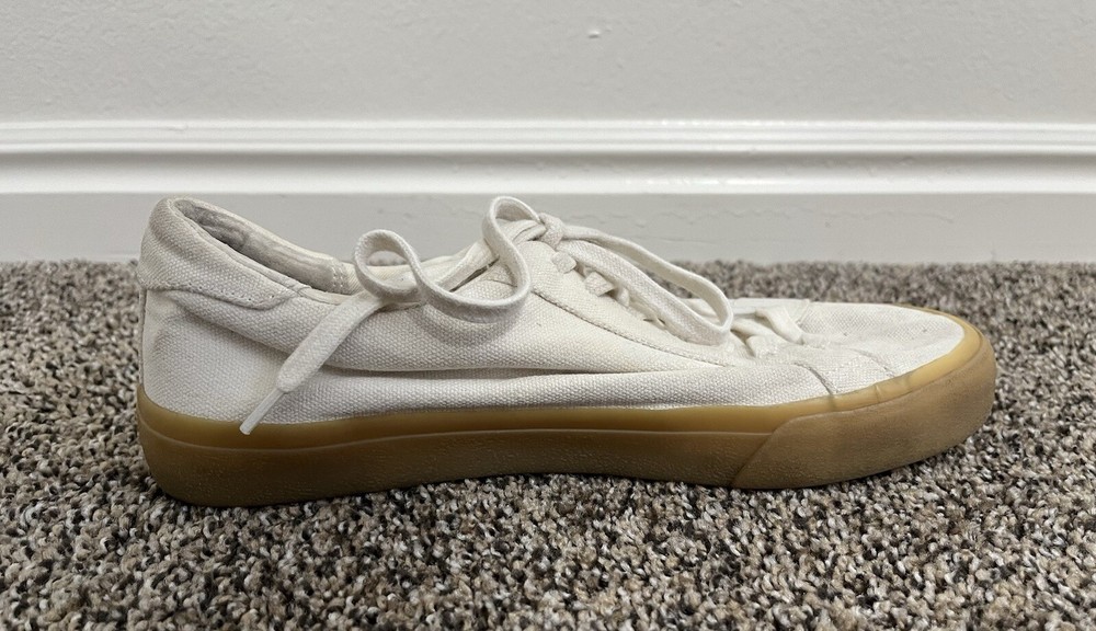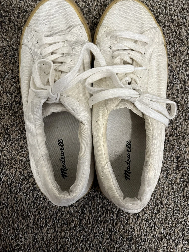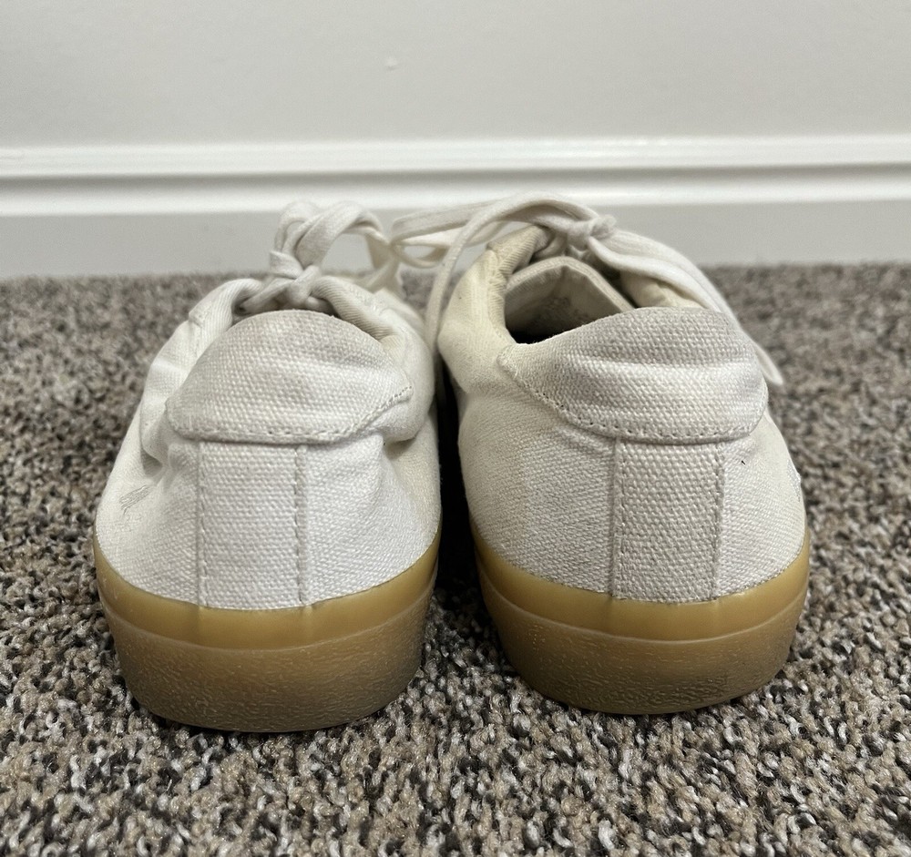 Madewell Women's Sidewalk Low-Top Sneakers in Monochrome Canvas Size 8.5 Womens Size 8.5 Mens Size 7 Color: Pale Parchment (Off White) Details from Madewell website: We designed our first-ever sneakers with the idea that shoes should be comfortable from the get-go. Made of monochromatic canvas, these low-tops have MWL Cloudlift insoles for a supercushy, ultra-supportive fit that feels like walking on a...well, you know. When you select your size, "H" equals a half size. Please note: These sneakers run large, so we recommend ordering a half size smaller than your normal size. Canvas upper. Rubber sole. Import. Item L3248 Shoes have some wear and could be cleaned further by buyer.
