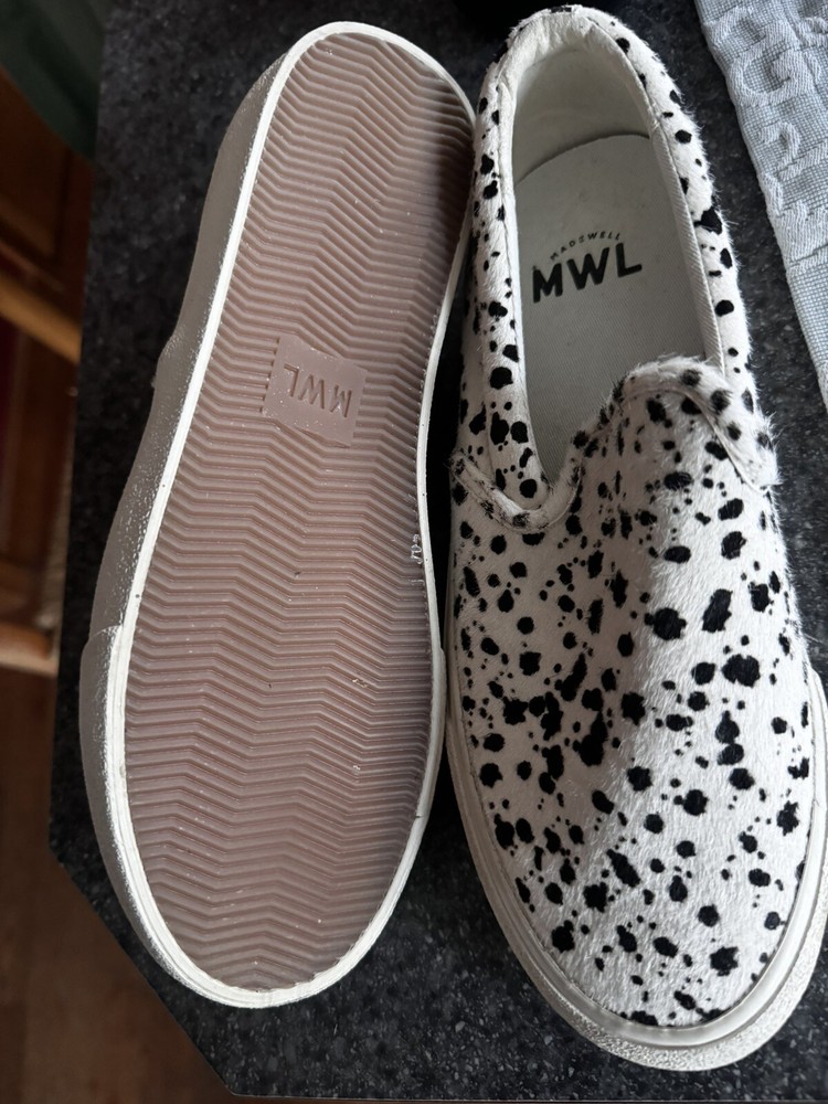 The product is a pair of Madewell slip-on sneakers for women in size 8. They feature a low top style with a white and black animal print design made of real fur. The shoes have a round toe shape, slip-on closure, and a flat heel. The outsole is made of rubber, and the lining material is cotton, making them suitable for casual wear and walking.