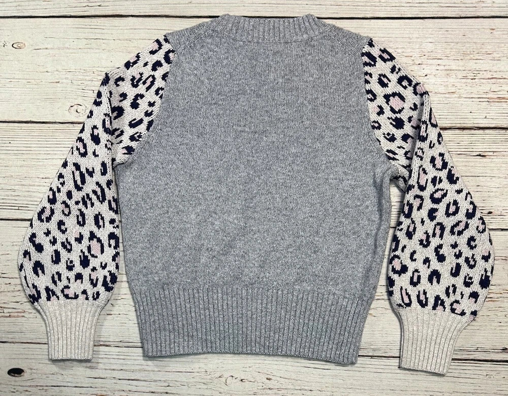 Elevate your wardrobe with this Madewell Tensley sweater pullover. The gray color and leopard balloon sleeves add a touch of bohemian and fun to your outfit, making it perfect for travel, parties, workwear, and casual occasions. The crew neck and classic fit provide comfort and breathability, while the cotton and merino wool materials ensure stretch and durability. Hand wash only to maintain the quality of the tight-knit fabric. This sweater is perfect for winter, fall, and spring seasons. The animal print pattern and modern theme make it a great addition to any college or preppy wardrobe. Check pictures for condition and measurements for size.