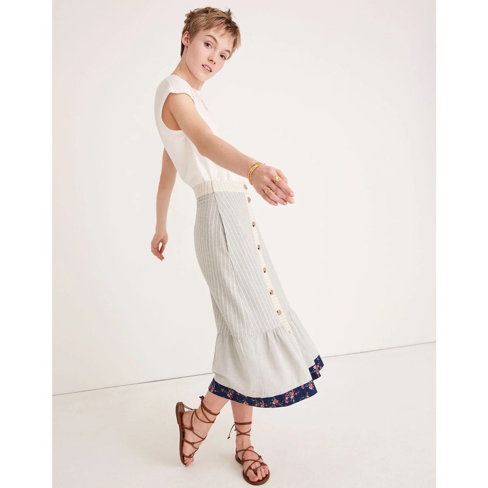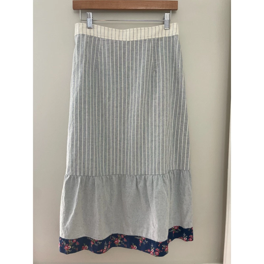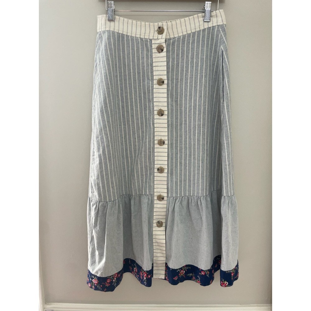 Madewell x The New Denim Project Boho 70's Ruffle Patchwork Button Midi Skirt Size 2. WLF 14.5 inches, length 31 inches. Based in Guatemala, The New Denim Project takes textile leftovers from mills and upcycles them into brand-new fabric (even their manufacturing waste gets turned into compost for local coffee beans). We teamed up on a feel-good capsule inspired by homespun '70s handwork—this button-front midi skirt mixes stripes with floral print and has a retro ruffled hem. 100% Cotton. Excellent used condition, no flaws noted. Please don't hesitate to ask any further questions. Smoke free pet friendly home. Check out my other listings for a bundle deal! Boho 70's Ruffle Prairie Patchwork