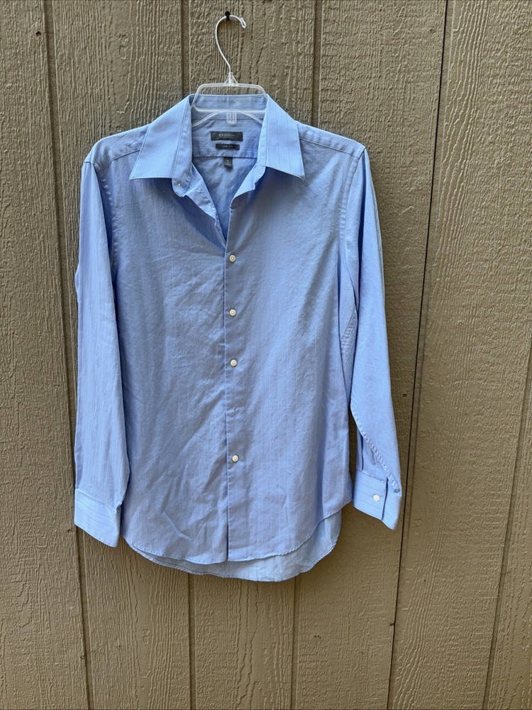 The Madison Men's Shirts in Sky Blu, size M, feature a classic collared design with long sleeves and a slim fit. Made from 100% cotton with a medium level fabric wash, these button-up shirts are suitable for casual, formal, and business occasions. The solid blue color and barrel cuff style add a touch of sophistication to this timeless piece of men's clothing. With the brand's reputation for quality and style, these shirts are a perfect choice for the modern man looking for a versatile wardrobe staple.