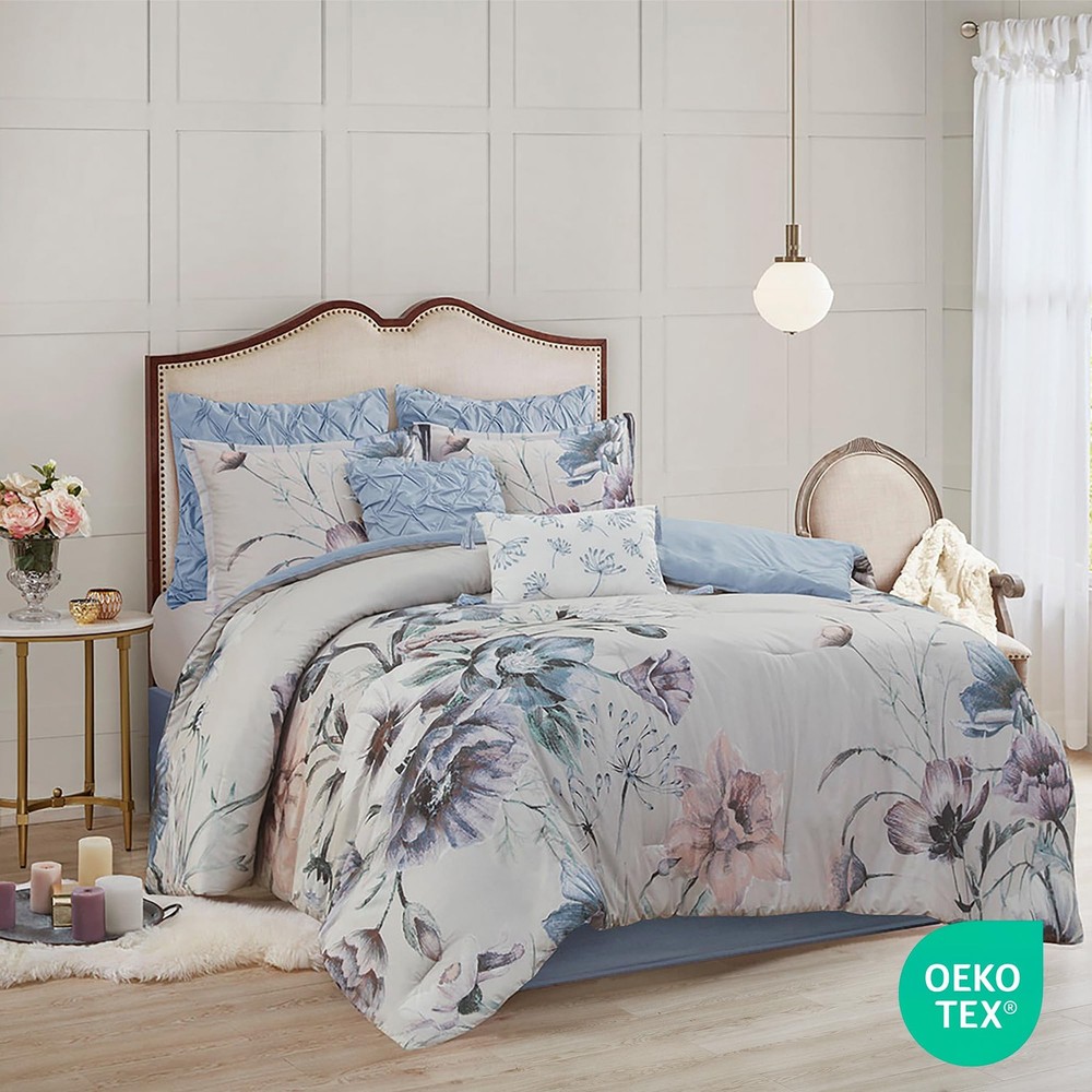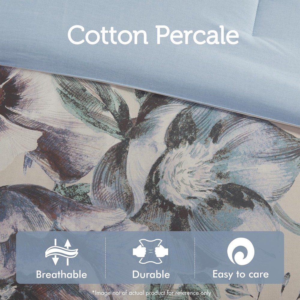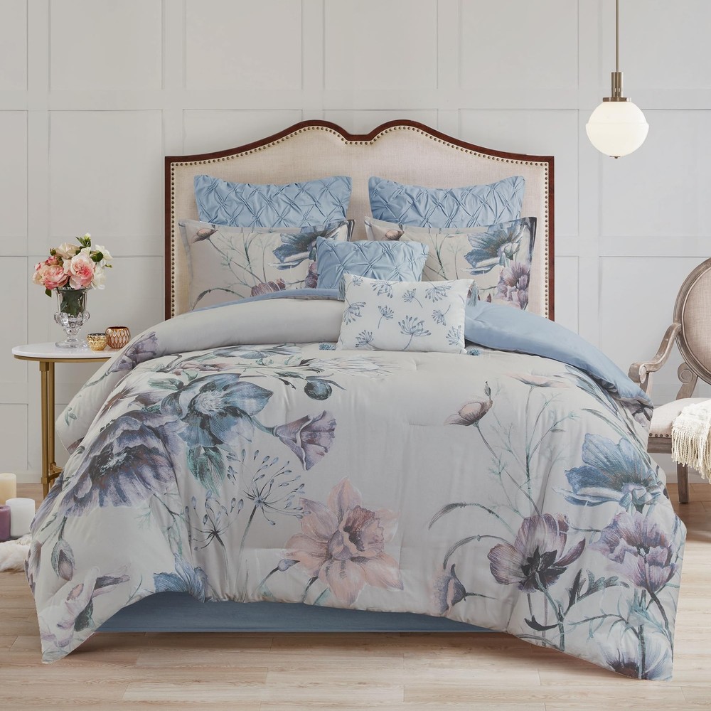 COMFORTER SET: The Cassandra 8 Piece Cotton Printed Comforter Set offers a beautiful shabby chic approach and romantic allure to your bedroom. Soft and breathable cotton cover with ample filling will give all season comfort DESIGN: The cotton face, cotton/polyester back comforter and shams feature a large floral print, in soft blue hues, creating a gorgeous look COMFORT: Soft & naturally breathable and lightweight cotton poly blend fabric comforter for a perfect all season bedding Set includes: 1 Comforter: 104"W x 92"L, 2 King Shams: 20"W x 36"L + 2"D, 1 Bedskirt: 78"W x 80"L + 15"D, 2 Euro Shams: 26"W x 26"L, 1 Decorative Pillow: 18"W x 18"L, 1 Decorative Pillow: 12"W x 18"L CARE: machine washable, spot clean pillow. For best result recommended to use commercial size washer and dryer