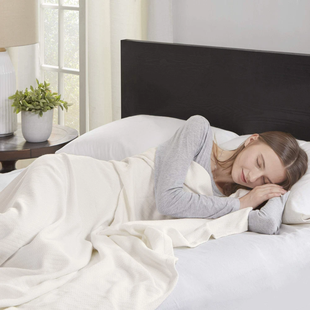 Cozy up in one of the softest cotton blankets on the market. We take the highest quality cotton and spin it into a very smooth and soft material that we call Liquid Cotton. This blanket's cotton material virtually eliminates pilling to give you a lasting blanket that you will not have to replace year after year. Our Liquid Cotton blanket has reduced shrinkage compared to other cotton blankets. Cotton naturally wicks away moisture and is breathable which helps regulate your temperature at night, giving you year round comfort. This blanket is also OEKO-TEX certified, meaning it does not contain any harmful substances or chemicals to ensure quality comfort and wellness. A classic cotton comfort that comes in vibrant color; our liquid cotton blanket is a premium 100% cotton blanket that's particularly ring spun and woven into a smooth patterned blanket. This is a perfect summer blanket featuring exceptionally soft premium cotton that naturally wicks away moisture, and breathable giving you year round comfort. Our liquid cotton virtually eliminates shrinkage and pilling, giving you a lasting confidence in quality and durability in the years to come. 1 Full/Queen Size Blanket: 90"W x 90"L For you convenicend it's machine wash cold, gently and separately. Do not bleach. Tumble dry low. Remove promptly.