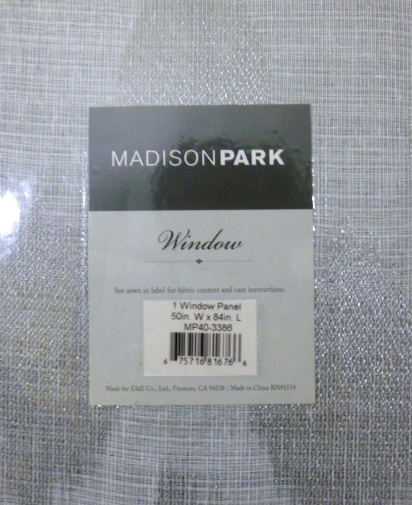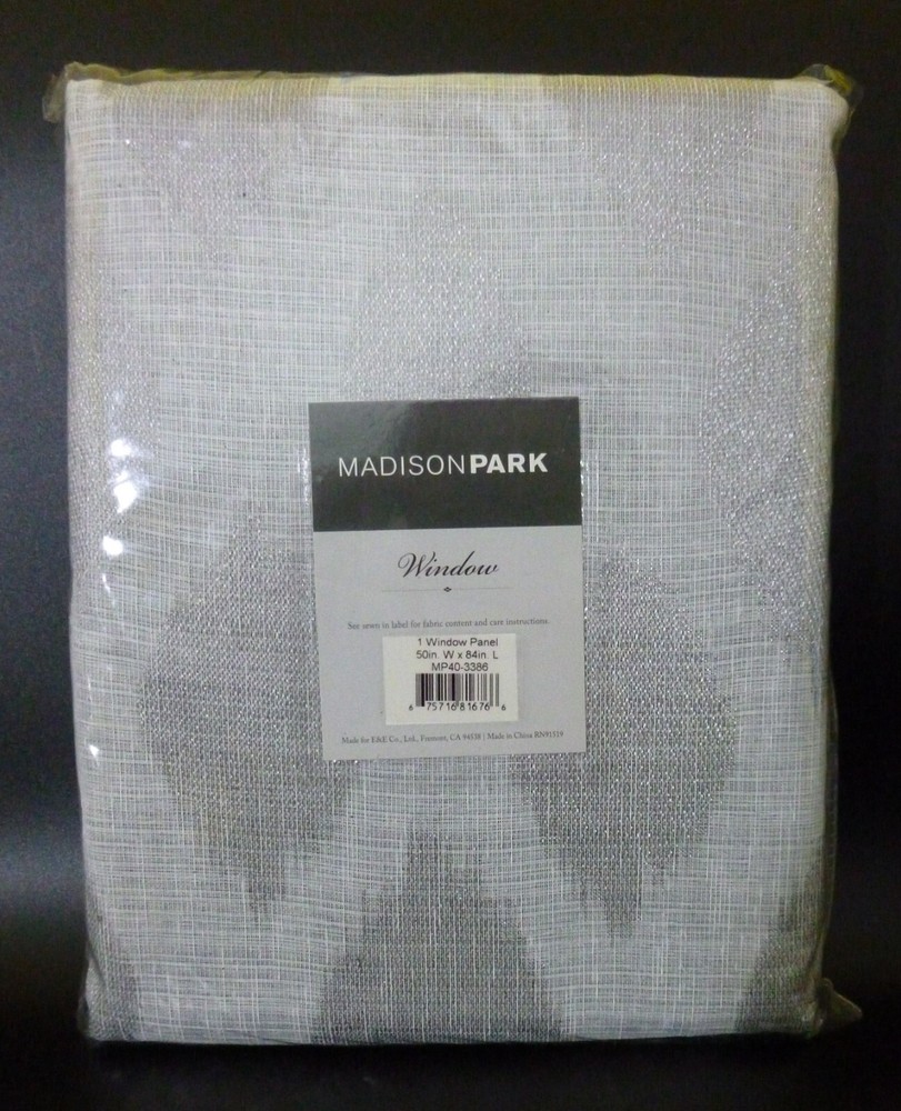 Madison Park ~ Metallic Ogee Sheer Window Panel with Blackout Lining 1 Window Panel Stock Photo above shows the actual panel style, stock photo is a bit off with the color. Please look at the 2 other pictures to see the actual color of the Window Panel. You will only receive 1 Window Panel. Madison Park Metallic Ogee Sheer Panel with Blackout Lining is the perfect introduction of cool and casual glimmer. The sheer dry hand fabric features metallic thread woven in for an intricate etched design. Panel features an added black out liner creating fullness and better drapability, while providing benefits of added privacy, room darkening, and energy saving abilities. Grommet top detail makes it easier to hang, open, and close panels throughout the day. Fits up to 1.25-inch diameter rod. Size: 50x84 Inches Color: silver We Ship within 1-2 Business Days 1