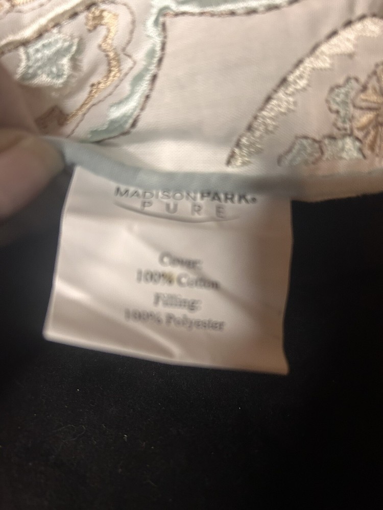 The Madison Park Pure Paisley Design Pillow features a white background with a stunning paisley pattern in shades of blue and gold. Measuring 17 inches by 11 inches, this decorative pillow is a stylish addition to any home decor. Perfect for adding a touch of sophistication and elegance to a living room or bedroom, this pillow is designed to enhance the aesthetic appeal of the space.