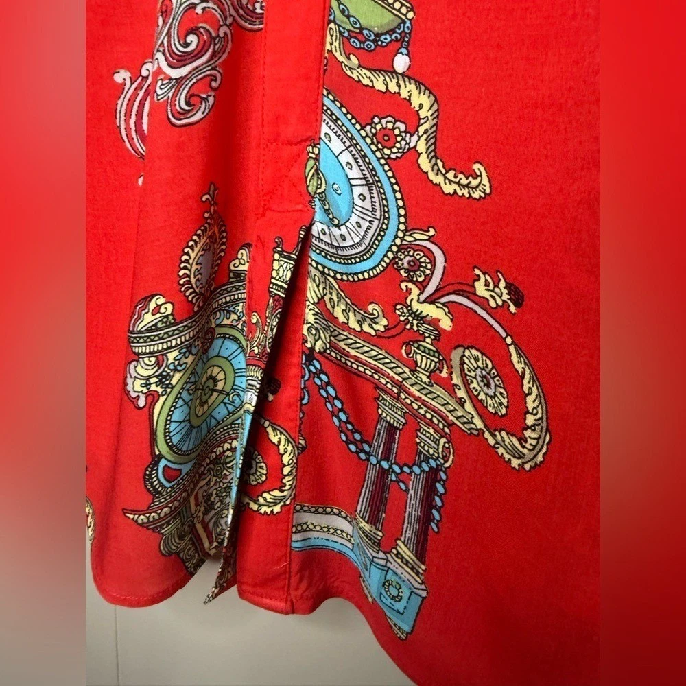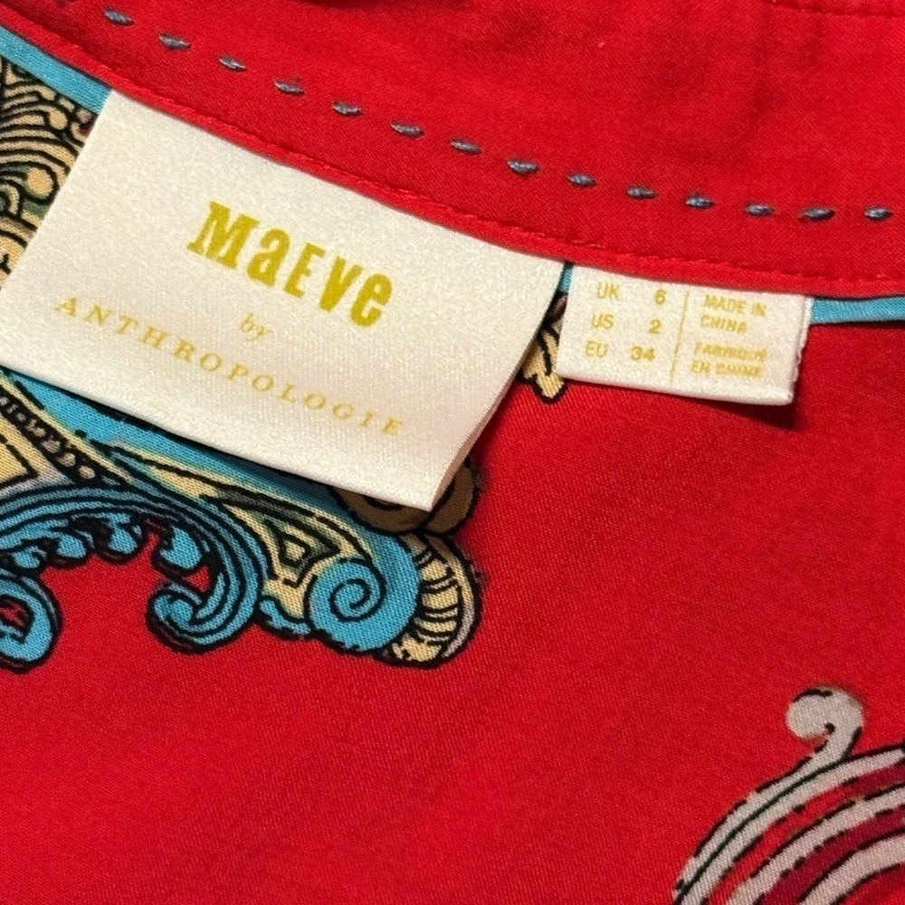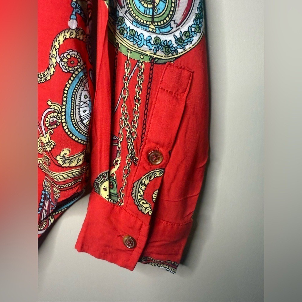 Maeve for Anthropologie featuring an ornate baroque and medallion print with chain and clock detailing. Lightweight and fluid with a polished yet playful feel. This piece is perfect for dressing up denim, layering under blazers, or styling with faux leather and boots for an elevated boutique look. The vibrant red base paired with turquoise, gold, and cream accents gives this top strong statement energy while still being versatile enough for everyday wear. A great piece for capsule wardrobes, resort styling, or bold casual outfits. Details: Brand: Maeve by Anthropologie Size: 2 Color: Red with multicolor baroque print Button front closure Long sleeves with button cuffs Chest pocket Lightweight woven fabric Measurements: Pit to Pit: 18.5 in Length: 26 in Condition: Excellent pre-owned condition. All buttons intact. No flaws noted. Model image was created using AI for styling and visualization purposes only.*