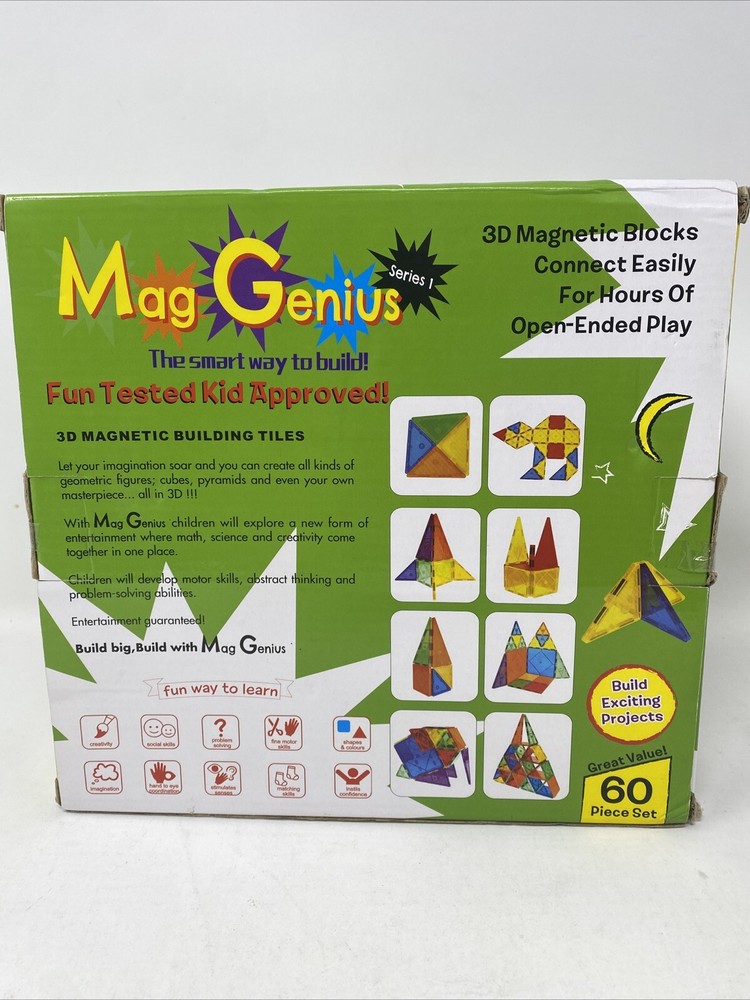 Introducing the Mag-Genius 3D Magnetic Building Tiles, a set of 60 pieces that will surely provide hours of fun and creativity for kids and adults alike! This toy is perfect for those who love to build and create, and it comes in a variety of colors that will make any project more colorful and vibrant. The tiles are made by Sinceroduct, a trusted brand that ensures high quality and durability. The recommended age range for this toy is 3 and up, making it perfect for young children who are just starting to explore the world of building and creating. With the Mag-Genius 3D Magnetic Building Tiles, kids can let their imagination run wild and come up with their own unique projects that will surely spark their creativity. This toy is perfect for both indoor and outdoor play, and it is sure to provide hours of fun and entertainment for kids and adults who love to build and create. Box Condition: - Storage wear with some minor tears, scuffs or scratches. Item itself is in pristine condition. Shipping: -Will ship per customer's selection. -Will ship same or next day depending when payment is received and closing hours of carriers. -We may choose another carrier to improve your experience with your order. -Expect a longer transit time with the USPS. International Shipping Global Shipping Program (GSP) Returns: -Returns are generally not accepted. Feel free to reach out with any questions or additional pictures. Your satisfaction is my goal. Thank you kindly for your visit. If you like what you see, check out other items under "The Penny Lot". https://www.ebay.com/str/thepennylot