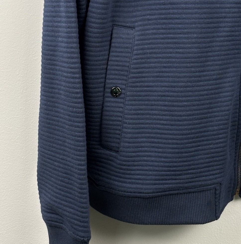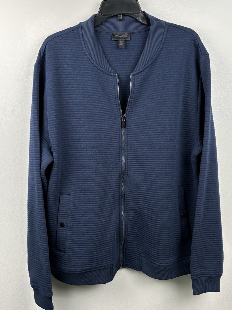 The Magaschoni Men’s Rib Knit Full Zip Jacket in Navy Excellent used condition. Looks new. No stains tears or snags Side pocket with snap closure Like new condition Size large Chest width pit to pit 23” across Length 27” Ships fast via USPS Made from comfortable cotton knit fabric with a ribbed texture, this mid-length jacket features a full zip closure and pockets for added convenience. The navy color and solid pattern make it a classic choice suitable for winter, fall, and spring seasons.