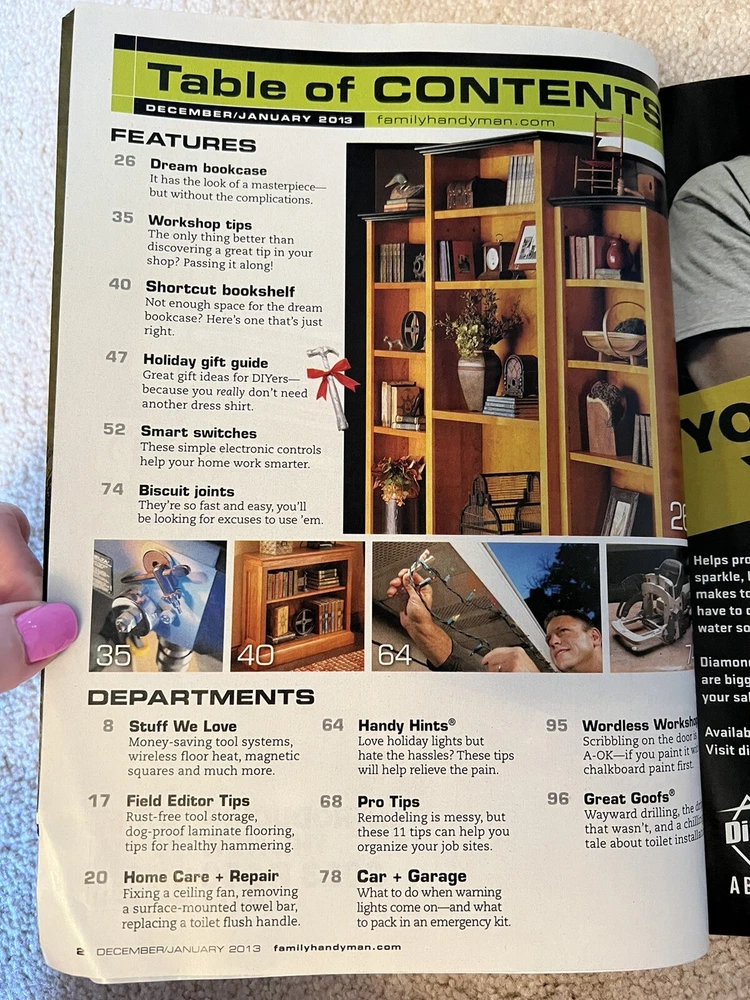MAGAZINE TITLE : Family Handyman No-excuses Bookcase - you don't need tons of cash, skill or tools What to do if your engine light goes on Special woodworking section - shortcut shelves, workshop tips FORMAT : Magazine PUBLICATION DATE : December / January 2013 CONDITION : Brand New - never read. Been sitting on a shelf. One crease on front cover corner. Name & address covered by pink notecard in picture PAYMENT : Payment is due within 3 days of the end of the auction. SHIPPING : Shipping is via US Post Office ONLY. RETURN POLICY : I list items to the best of my ability and try to describe each item as best as possible. Items that were grossly missrepresented may be returned for a refund of bid price only (I will not refund any postage). Refunds will be issued once I receive the item back. Please check out my other items - I will gladly combine shipping! Email me if you have any questions.