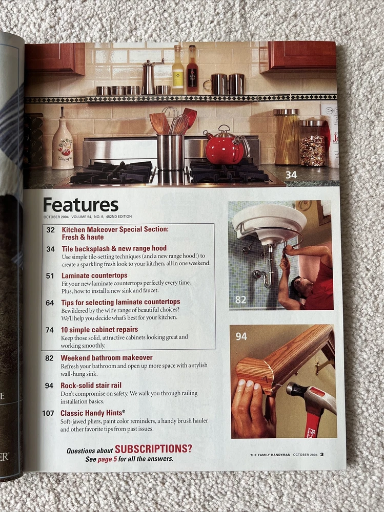 MAGAZINE TITLE : Family Handyman Expand your bathroom with a wall-hung sink Annual kitchen & bath special issue Kitchen makeover in 2 weekends 10 fixes for tired cabinets Smart choices for laminate Safe, secure stair railings FORMAT : Magazine PUBLICATION DATE : October 2004 CONDITION : Brand New - never read. Been sitting on a shelf. No creases (see pics) PAYMENT : Payment is due within 3 days of the end of the auction. SHIPPING : Shipping is via US Post Office ONLY. RETURN POLICY : I list items to the best of my ability and try to describe each item as best as possible. Items that were grossly missrepresented may be returned for a refund of bid price only (I will not refund any postage). Refunds will be issued once I receive the item back. Please check out my other items - I will gladly combine shipping! Email me if you have any questions.