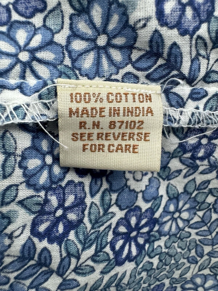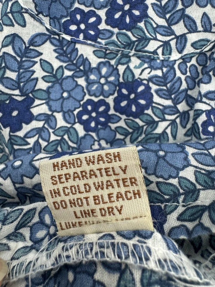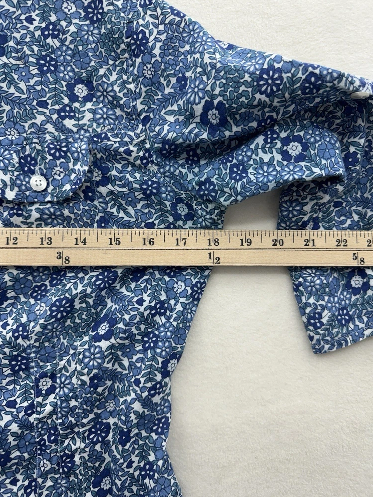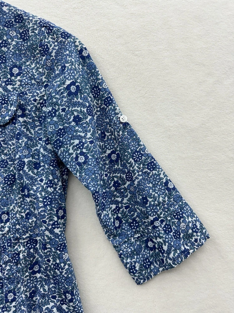 Looks as though it runs small please check measurements. Looks like a size small or possibly XS. Add a touch of floral charm to your wardrobe with this Magazine Woman's Medium Lightweight Button Up top. The blue flower pattern is perfect for any occasion, whether it's for travel, casual or business. The V-neckline and 3/4 roll tab sleeves add a stylish touch to this slim fit top, while the button closure ensures a secure fit. This top is made of lightweight cotton material, which makes it comfortable to wear during the summer, fall, or spring seasons. It's important to hand wash only to maintain its quality. The tie back feature adds an extra touch of elegance to this basic style top, making it a must-have addition to your wardrobe.