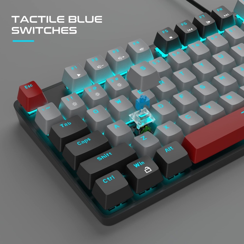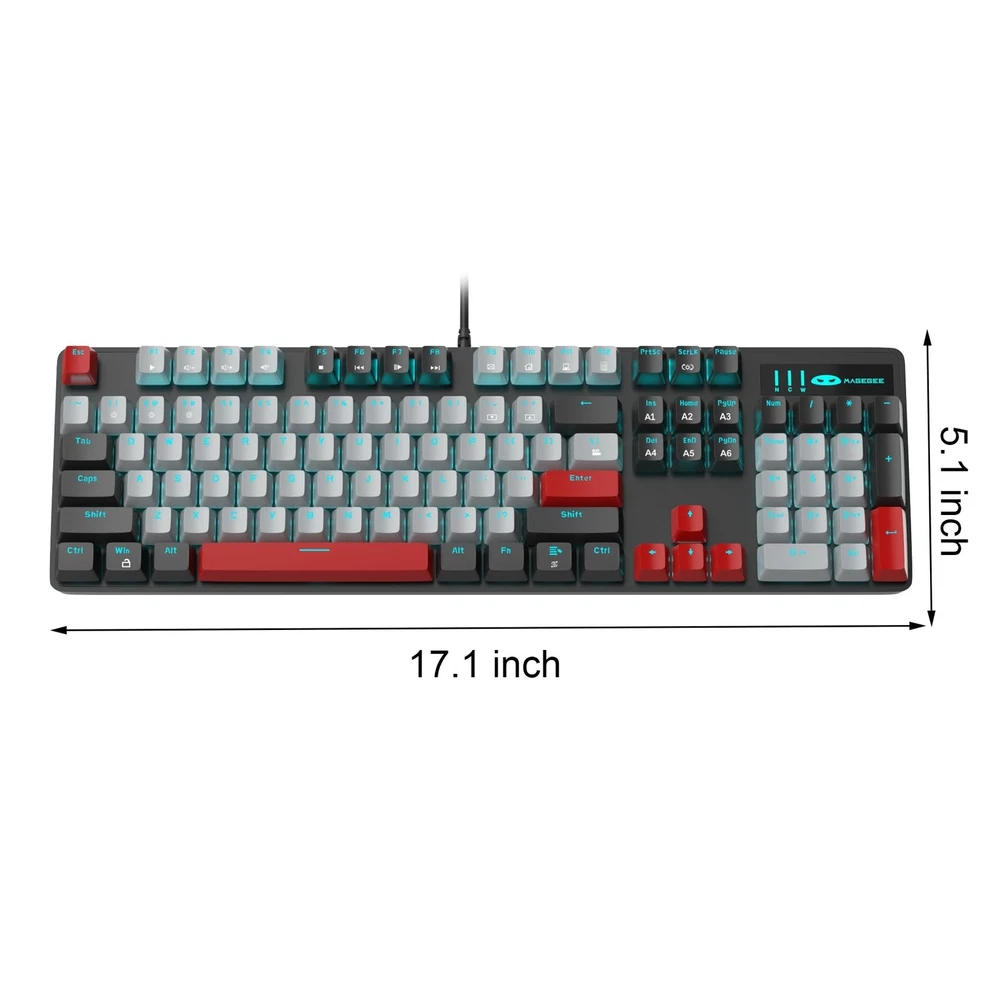 MageGee Mechanical Gaming Keyboard, New Upgraded 104 Keys Blue Backlit Keyboard with Blue Switches, USB Wired Mechanical Computer Keyboard for Laptop, Desktop, PC Gamers(Black & Gray) Product Details Color: Black & Gray - Blue Switch Brand: MageGee MPN: MK-Storm Black&Gray UPC: Does not apply EAN: Does not apply Brand: MageGee Compatible Devices: PC Connectivity Technology: USB Keyboard Description: Gaming Recommended Uses For Product: Gaming Special Feature: Lighting, Multimedia Keyboard Color: Black & Gray - Blue Switch Number of Keys: 104 Keyboard backlighting color support: Single Color Style: Modern Product Dimensions: 16.2 x 6.79 x 1.93 inches Item Weight: 2.49 pounds Manufacturer: MageGee Country of Origin: China Date First Available: December 8, 2020 BLUE BACKLIT GAMING KEYBOARD: MageGee keyboard is designed with single blue lighting effect, 20 different backlit modes, 5 backlight brightness levels and 5 backlit speed, creating a cool and colorful game atmosphere to enhance the excitement of the game. The backlight can be easily turned off. NOTE: THE WHITE & PINK / WHITE & BLUE KEYBOARDS COME WITH AN EXTRA SET OF KEYCAPS IN THE NEGATIVE COLOR SCHEME. THE BLACK & GRAY / GRAY & BLACK KEYBOARDS COME WITH 16 RED KEYCAPS. MECHANICAL GAMING KEYBOARD: This keyboard with blue switches has professional game mechanical shaft body with crisp click sound, delivering ultimate typing and gaming performance, more long-lasting and durable. Floating keys design, the keys of keyboard trigger sensitively. ERGONOMIC DESIGNED MECHANICAL KEYBOARD: The keyboard adopts ergonomic design and premium metal panel construction to make it super stable and pretty comfortable to type on without wrist support. Double-shot keycaps provide clear uniform backlit, ensuring that all letters are resistant to scratches, abrasion and fading. The keyboard is connected to computers through USB cable, easy to use, no driver needed, just plug and play. HIGHLY RESPONSIVE & ANTI GHOSTING KEYBOARD: All keys have individual switches with full n-key rollover, which provides faster response and better keystroke feeling. 104 mechanical keys are conflict free, allowing you to press or hold multiple keys simultaneously. 12 multimedia combination keys on the top of the keyboard (FN+ F1~F12) offer quick operations, great for gaming and office. WIDE COMPATIBILITY: The USB wired gaming keyboard works well with computer, PC, laptop, compatible with Windows 2000/Vista/Win7/Win8/Win10/MAC/Linux for gaming pc.