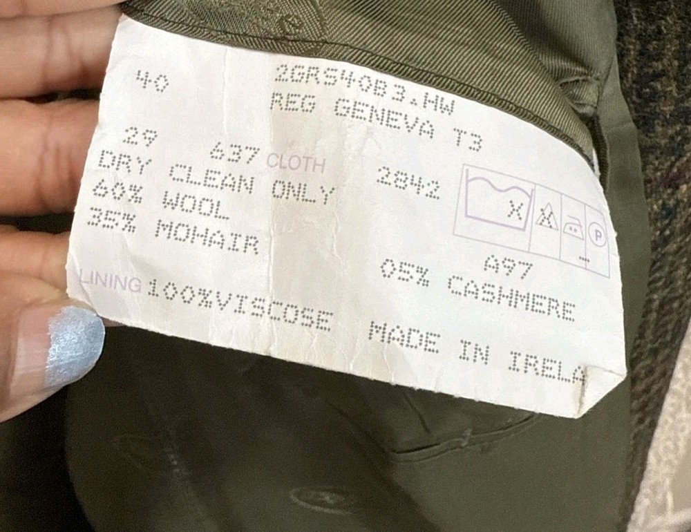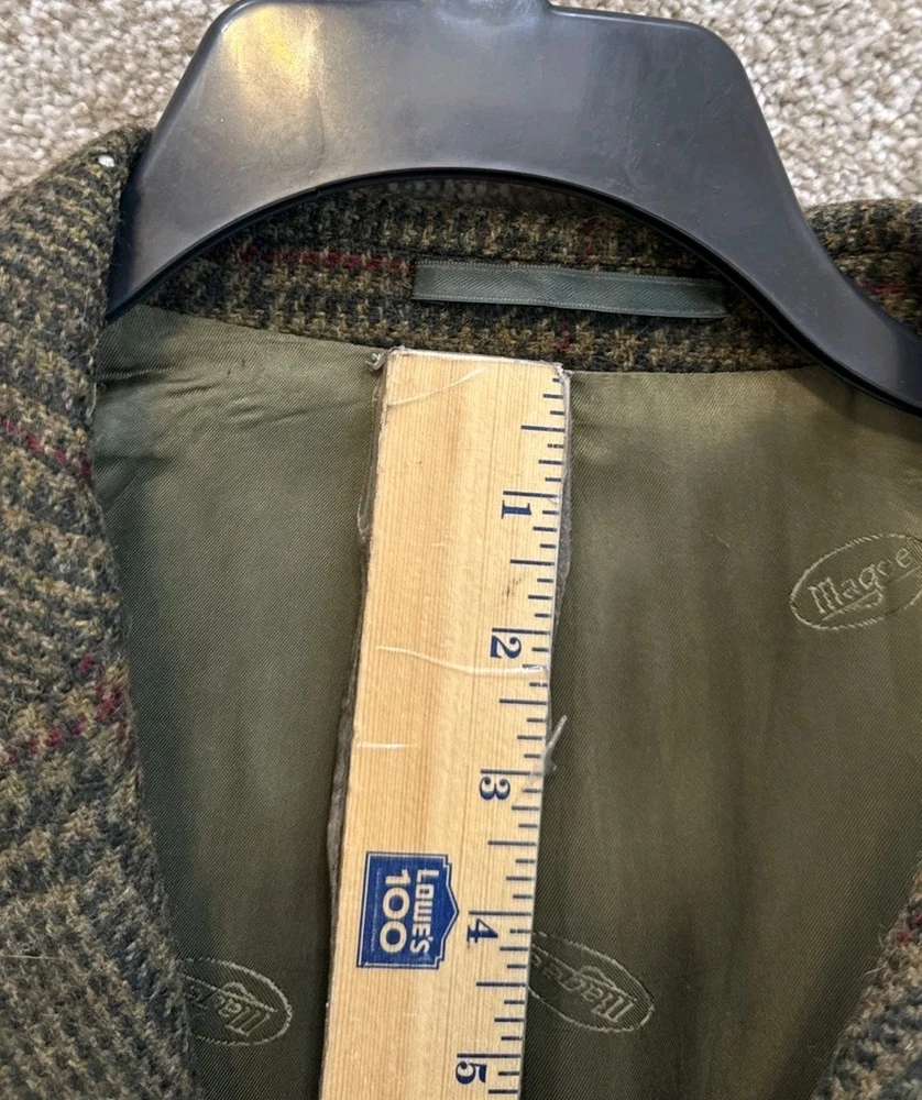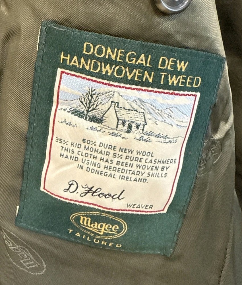 Jacket Lapel Style:NotchChest Size:40Size Type:RegularJacket/Coat Length:RegularSize:40Fit:RegularFabric Type:TweedJacket Cut:Single-BreastedType:BlazerJacket Sleeve Button Style:Three-ButtonColor:MulticolorStyle:JacketBrand:MageeSeller Notes:“Small mark on the collar shown in the photos.”Department:MenGarment Care:Dry Clean OnlyCountry of Origin:IrelandMaterial:Cashmere, Mohair, WoolJacket Front Button Style:Three-Button