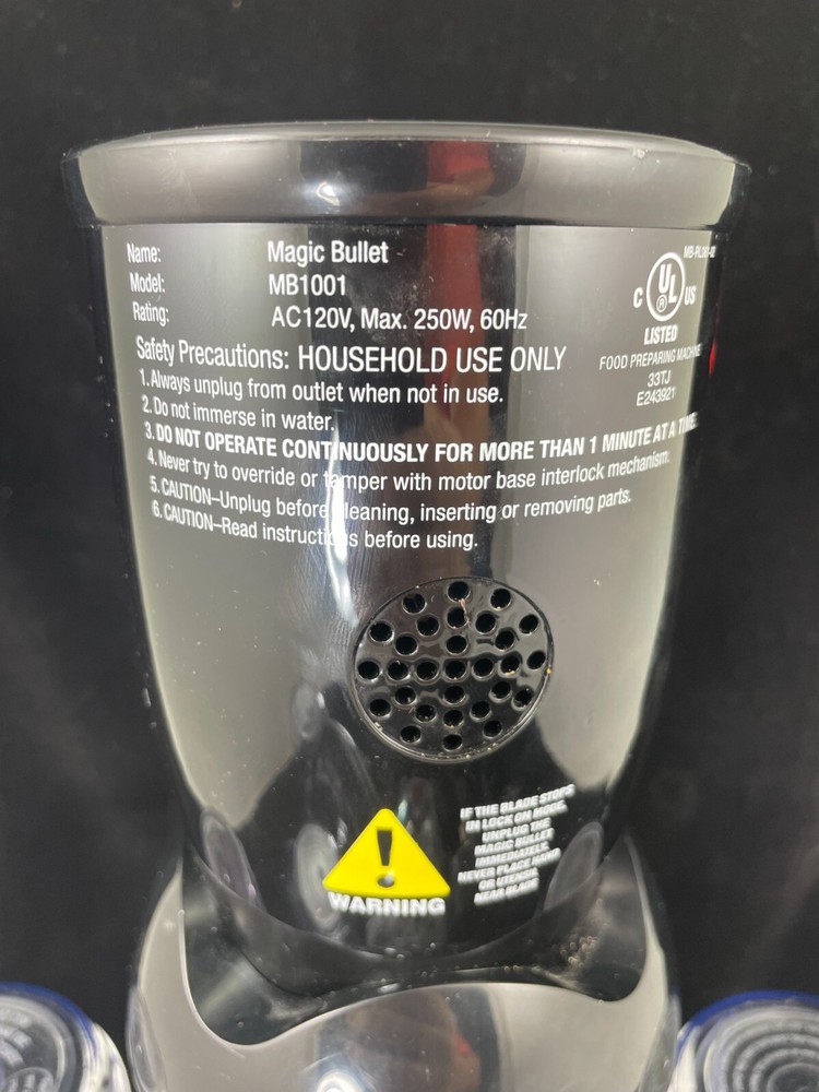 Features: Dishwasher Safe, Dishwasher-Safe Parts, Easy Clean, High Speed, Multipurpose Components Included: Blender Color: Black Brand: Magic Bullet Appliance Uses: Dips & Spreads, Frozen Drink, Sauce, Smoothie Material: Plastic Seller Notes: “A few of the pieces very lightly used the other pieces never used” Type: Bullet Blender Model: Magic Bullet MB1001