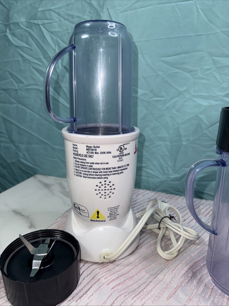 The Magic Bullet model MB1001 B is a powerful countertop blender with a built-in grinder, perfect for blending smoothies, soups, and sauces with ease. This compact appliance from Magic includes a blender component, making it a versatile addition to any kitchen. Its sleek design and convenient features make it a popular choice for those looking to upgrade their home kitchen with a reliable and efficient blender.