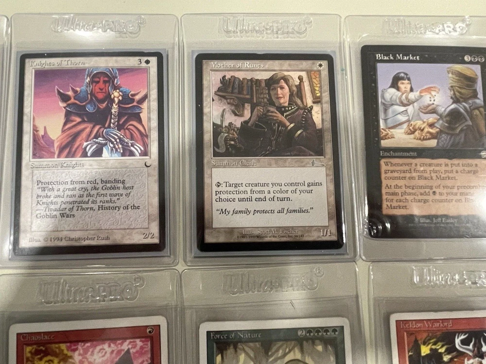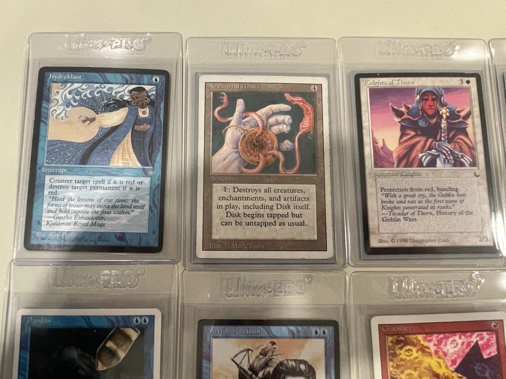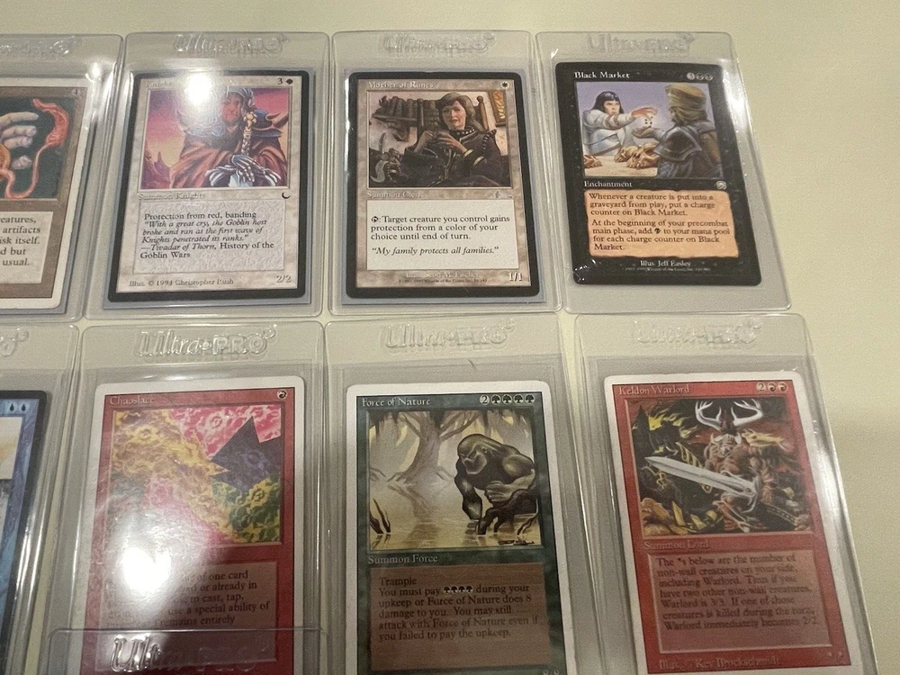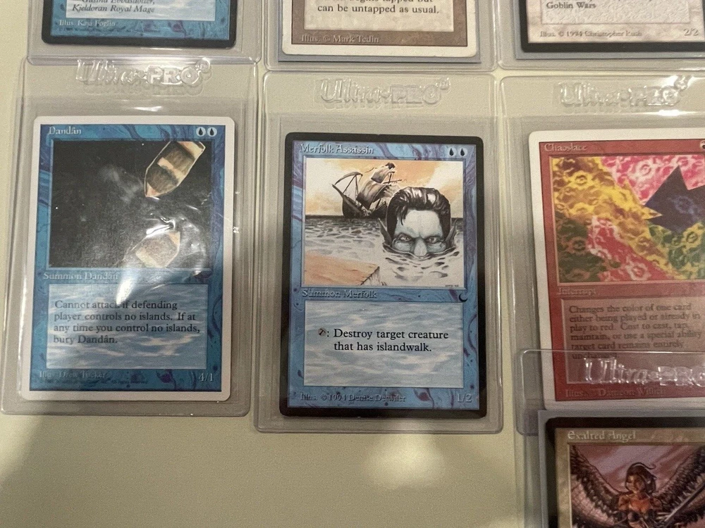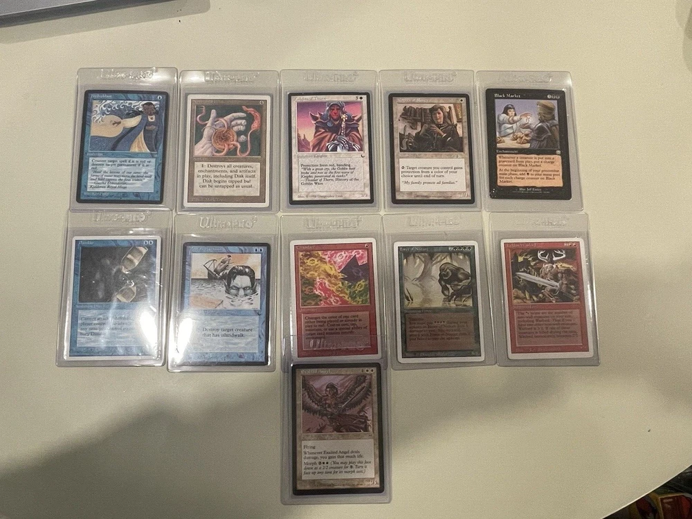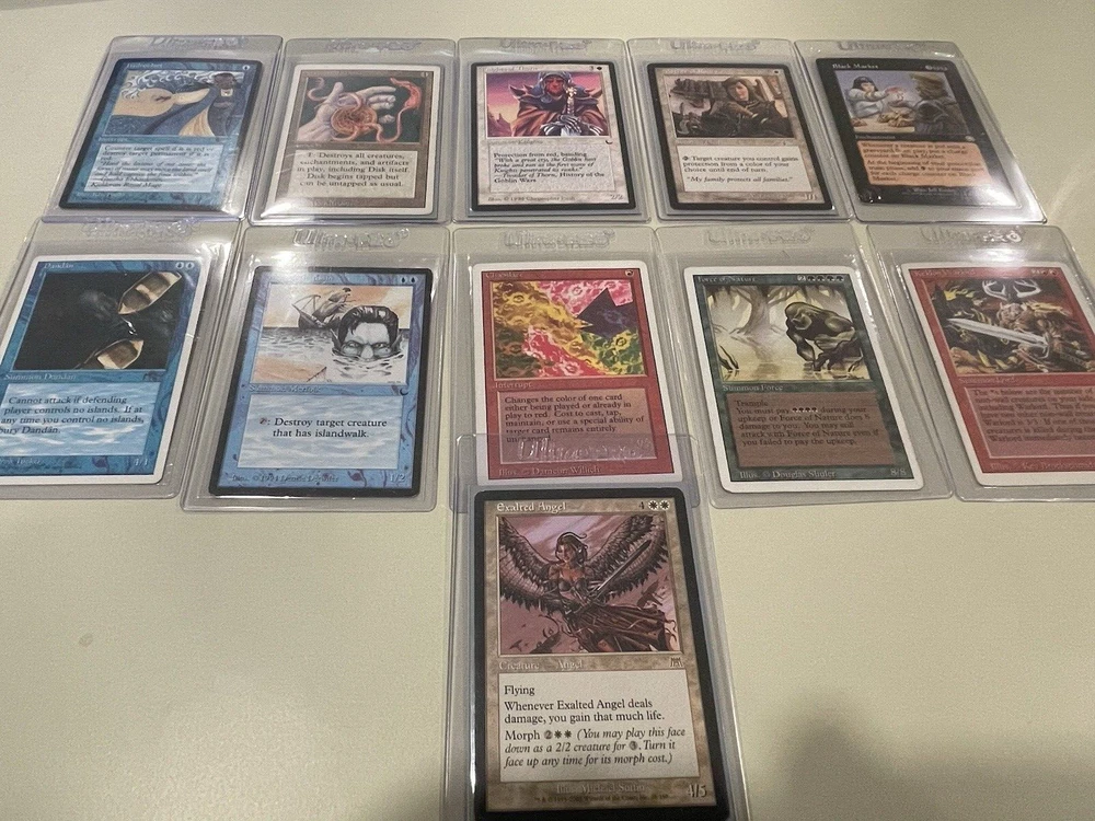 Set: Revised Edition, Ice Age, The Dark Manufacturer: Wizards of the Coast Finish: Regular Vintage: Yes Country/Region of Manufacture: United States Language: English Autographed: No Number of Cards: 11 Game: Magic: The Gathering Card Type: Creature, Instant, Artifact, Sorcery Attribute/MTG:Color: White, Blue, Red, Black, Green Card Name: exalted angel, keldon warlord, force of nature, merfolk assassin, chaoslace, knights of thorn, nevinyrral’s disk, dandan, hydroblast, mother of runes, black market Card Condition: Lightly Played (Excellent) Card Size: Standard