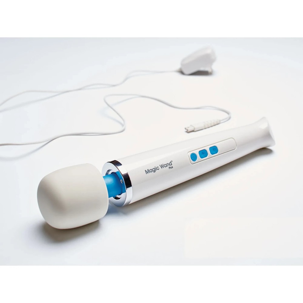 Designed in Japan and first sold in 1968, today's Magic Wand Plus is the result of decades of fine-tuning and re-engineering, like the finest automobile. It'll knock your socks off, every time. Sure, explore the joys of other sex toys, but always keep the Magic ready in your nightstand (it's also great for sore muscles!). Today's Magic Wand Plus comes to you with a fresh look, excellent function upgrades and the consistent power you crave. Now you can easily click back and forth, through 4 speeds: low (2,700 RPM), medium (3,800 RPM), high (5,400 RPM), and ultra (6,300 RPM!). Explore the smooth texture of the silicone head. Its flexible neck lets you target massaging sensations right where you want them! It’s amazing for targeting your neediest spots, for pleasure during partner play, and for massaging all types of sore muscles. A button lets you detach the power cord for easy storage when not in use. Do note: to avoid overheating and to protect its motor, the Magic Wand Plus will shut off automatically after 20 minutes. You can turn it back on after it’s cooled off.