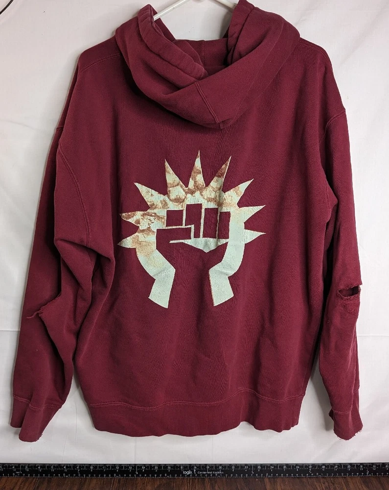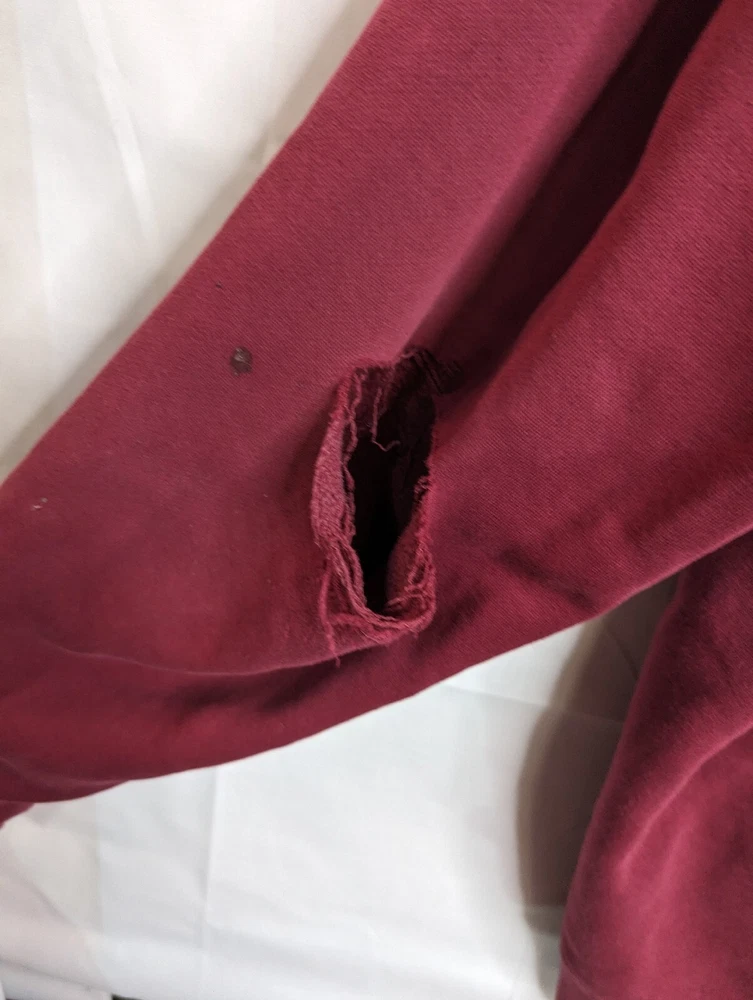 Hoodie has holes on both elbows, should be able to repair if you want to. Ships next business day.