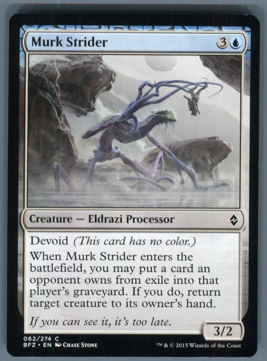 Please see pictures of the ACTUAL scans of the card. This is a nice example of a Battle for Zendikar #62 Murk Strider in Near Mint or Better . Other important information about this card: Magic_the_gathering tcg Murk Strider Common