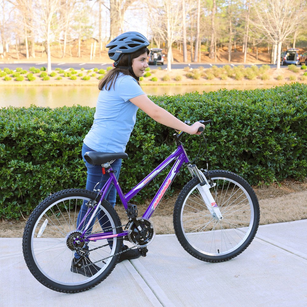 Let your child embark on thrilling adventures with the Magna Echo Ridge 24-inch Youth Bike. The bike boasts vibrant colors with pink, silver, and white accents on a purple frame that's sure to appeal to young riders. The sturdy frame features front and rear linear pull brakes, a comfortable padded seat, and an 18-speed index shifter to conquer any terrain.Features: 18-speed index shifter for versatile riding. Comfortable padded seat for long rides. Custom graphics for a stylish look. Perfectly sized for youth riders. Vibrant purple, pink, silver, and white accents. 23.62" W x 62.6" L x 40.16" H dimensions.Other sections: The Magna Echo Ridge 24-inch Youth Bike is designed for children with a seat height of 24 inches. Please note that assembly is required upon delivery. Free Shipping Over $49.99* Details Magna Echo Ridge 24-inch Youth Bike Product Description: Let your child embark on thrilling adventures with the Magna Echo Ridge 24-inch Youth Bike. The bike boasts vibrant colors with pink, silver, and white accents on a purple frame that's sure to appeal to young riders. The sturdy frame features front and rear linear pull brakes, a comfortable padded seat, and an 18-speed index shifter to conquer any terrain. Features: 18-speed index shifter for versatile riding. Comfortable padded seat for long rides. Custom graphics for a stylish look. Perfectly sized for youth riders. Vibrant purple, pink, silver, and white accents. 23.62" W x 62.6" L x 40.16" H dimensions. Other sections: The Magna Echo Ridge 24-inch Youth Bike is designed for children with a seat height of 24 inches. Please note that assembly is required upon delivery.