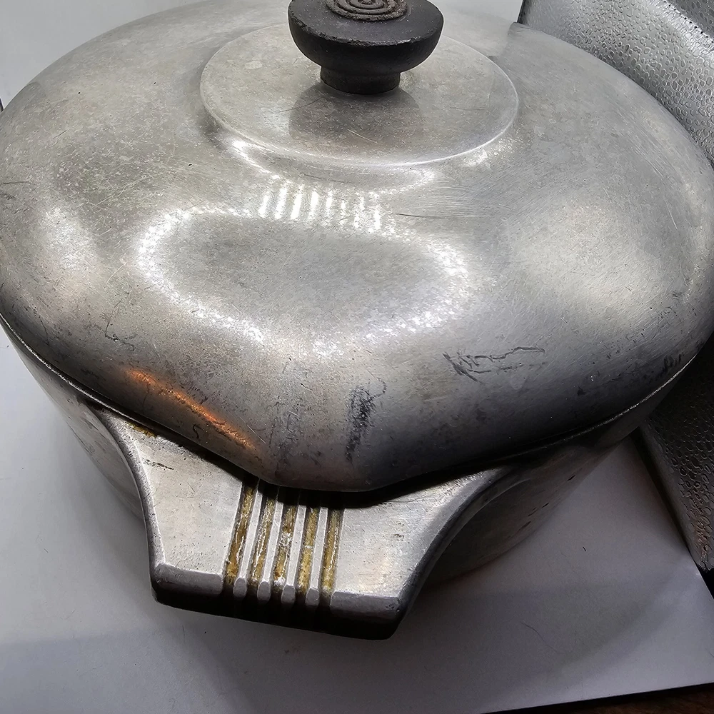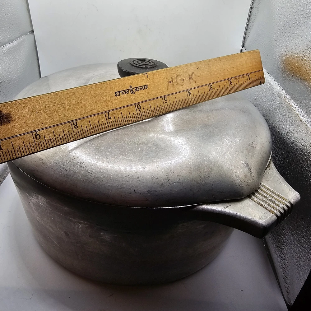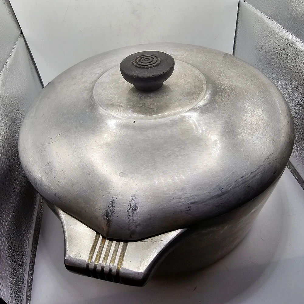 The Magnalite Classic 5 Quart Dutch Oven Stock Pot Pan is a vintage collectible piece from the 1950s, originating from the United States. This two-piece set includes a round-shaped pot made of cast aluminum in a silver color, suitable for use on both electric and gas stoves. The Dutch oven features a capacity of 5 quarts and comes with a lid and trivet insert, making it a versatile and functional addition to any kitchen. With its original design and stainless steel surface coating, this Magnalite piece exudes a retro charm that collectors and cooking enthusiasts alike will appreciate. There is staining and scratches. See photos for wear sold as is