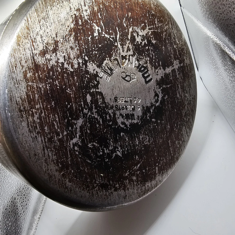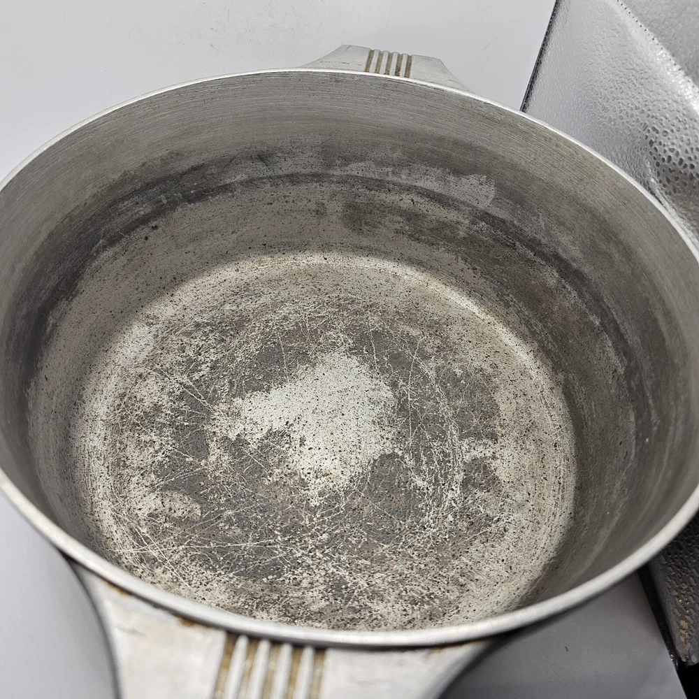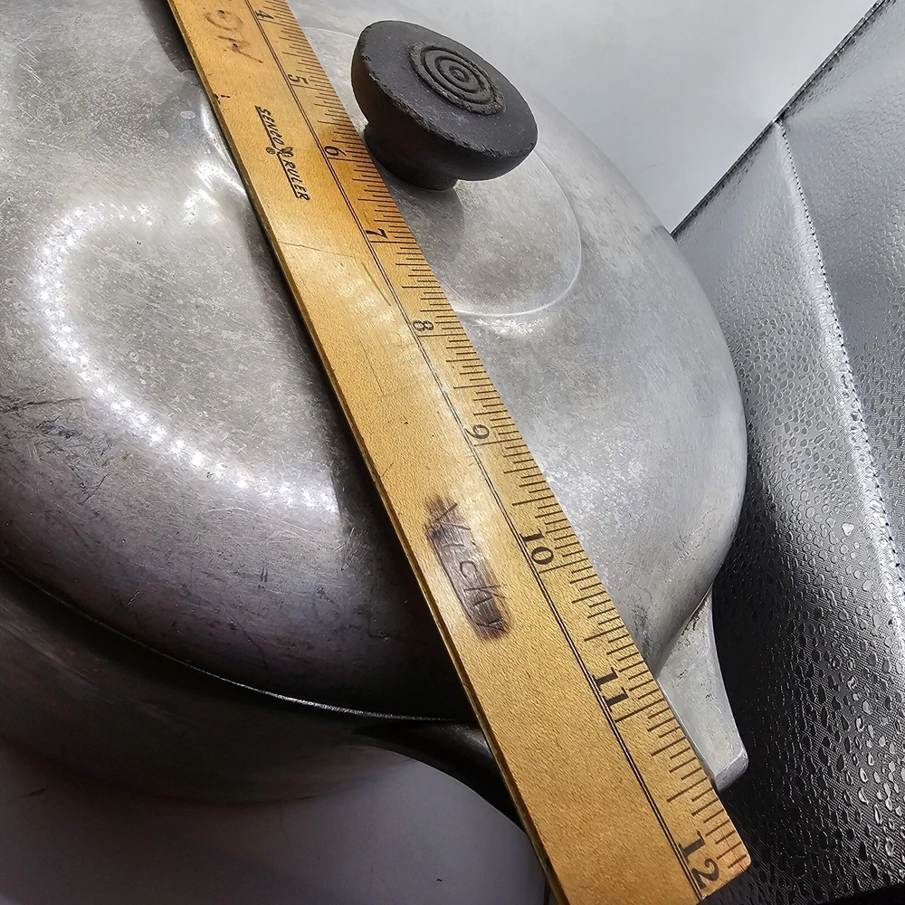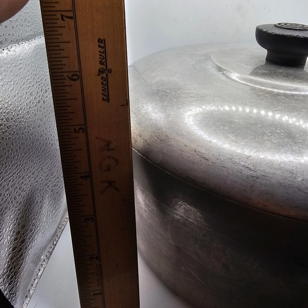 The Magnalite Classic 5 Quart Dutch Oven Stock Pot Pan is a vintage collectible piece from the 1950s, originating from the United States. This two-piece set includes a round-shaped pot made of cast aluminum in a silver color, suitable for use on both electric and gas stoves. The Dutch oven features a capacity of 5 quarts and comes with a lid and trivet insert, making it a versatile and functional addition to any kitchen. With its original design and stainless steel surface coating, this Magnalite piece exudes a retro charm that collectors and cooking enthusiasts alike will appreciate. There is staining and scratches. See photos for wear sold as is