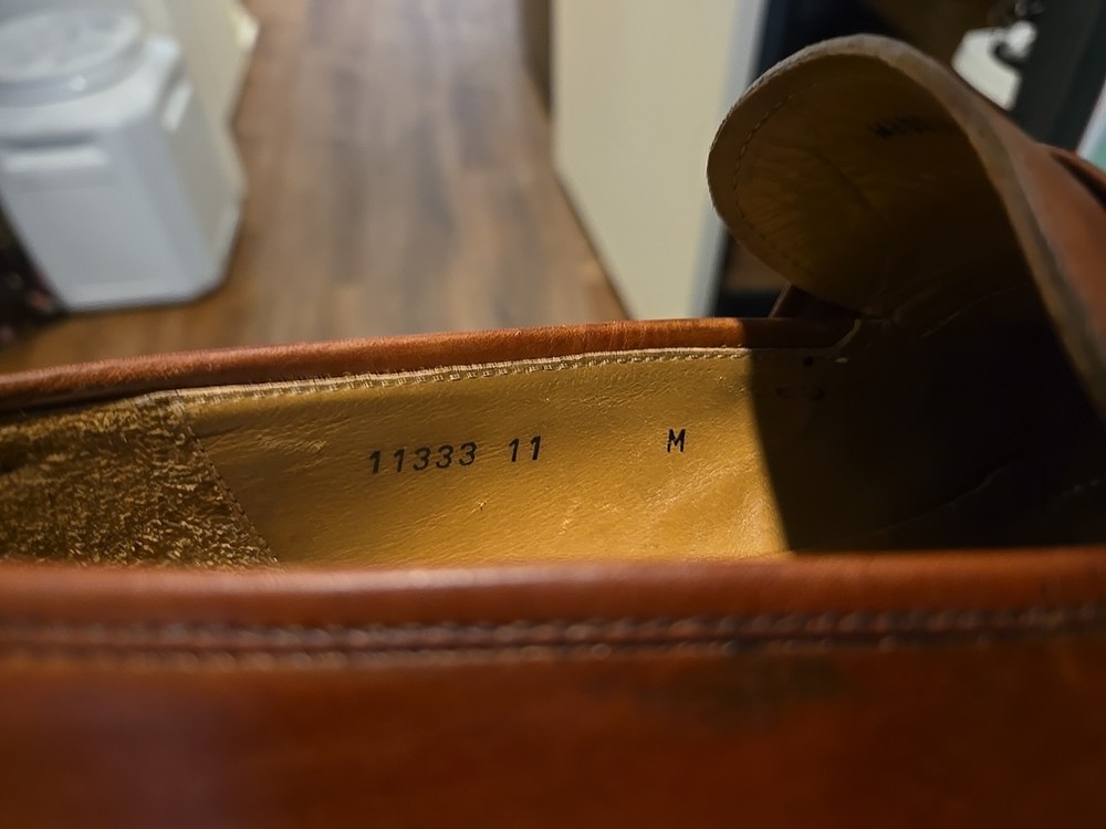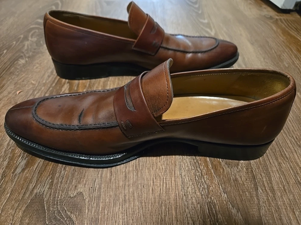 The Magnanni 11333 Men's Brown Leather Apron Toe Italian Loafers are a stylish and sophisticated choice for men looking to elevate their formal footwear. These slip-on loafers feature a classic round toe shape and are crafted from high-quality leather, providing comfort and breathability. The brown leather material with penny accents and a solid pattern make them versatile for various occasions, whether it be a wedding, going out in the city, or a special event. Made in Spain by the renowned brand Magnanni, these dress shoes combine luxury and elegance to make a statement. Bottom rubber is starting to come off a little.