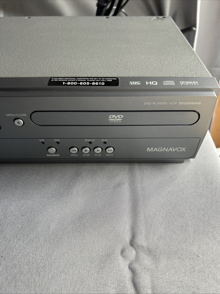 The Magnavox DVD/VHS Combo Player DV200MW8 is a versatile device that allows you to play various types of media formats such as DVD, CD, DVD-R, DVD+R, DVD+RW, DVD-RW, CD-R, CD-RW, and VCD. With its built-in VCR feature, you can also enjoy your favorite VHS tapes. This model has been tested and confirmed to be in working order, making it a reliable option for those looking to enjoy their media collection with ease. The product does not come with a remote, but its basic functionality can still be accessed and enjoyed.