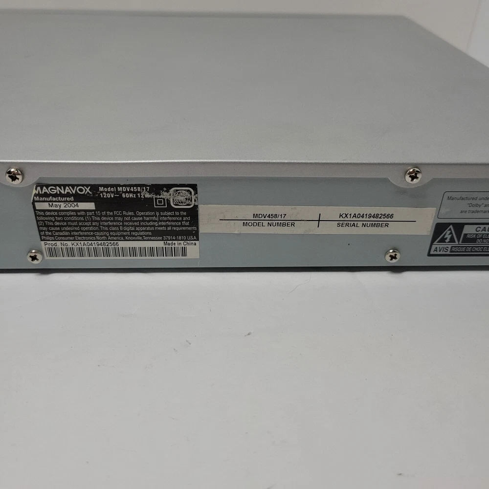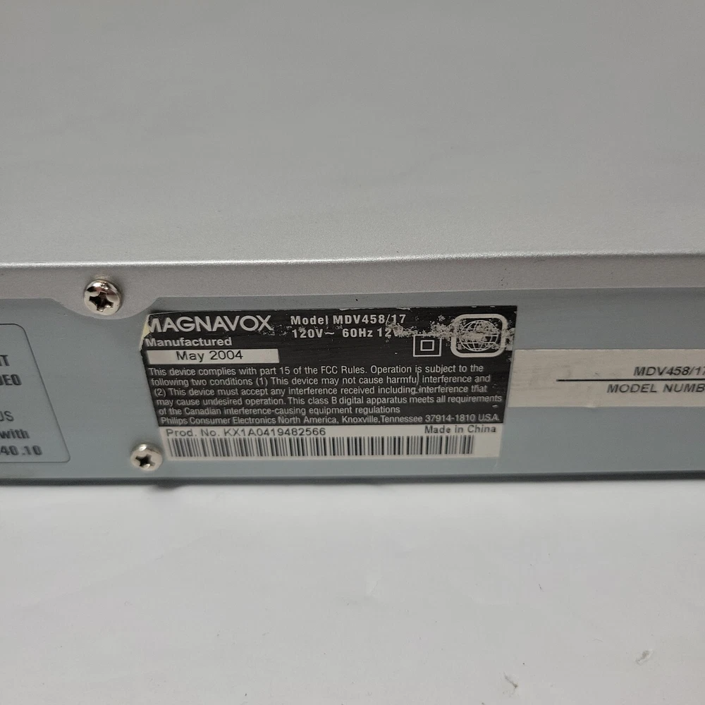 Country/Region of Manufacture: Unknown Type: DVD Player Color: Silver Recordable Media Format: DVD-R Playable Disc Formats: DVD Screen Size: na Playable Media Format: DVD Video Custom Bundle: No Model: MDV458/17 Region Code: DVD: 1 Storage Capacity: na MPN: Does Not Apply UPC: Does not apply Brand: Magnavox gtin13: Does not apply Number of VCR Heads: 4 Connectivity: Composite Video RCA Features: VCR