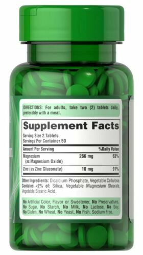 Puritan's Pride Magnesium with Zinc-100 Tablets Minerals are important constituents of any healthy diet. Todays farming methods often strip essential minerals from the soil. Add to that, high fat content and over-processing of foods in a "normal diet" and you have a recipe contrary to good nutrition needed for good health. This supplement is a very good source of Magnesium and Zinc your body needs daily to help maintain good health. Adequate magnesium intake is used to support contraction and relaxation of muscles, help avoid leg cramps and maintain proper muscle function. According to the National Institute of Health, magnesium intake by most American adults is lower than recommended. It also helps bone health and nervous system function, and is beneficial for healthy immune system and cell growth. Together, this Magnesium and Zinc combo offer a quality supplement that cam help ensure adequate levels of these two important nutrients.