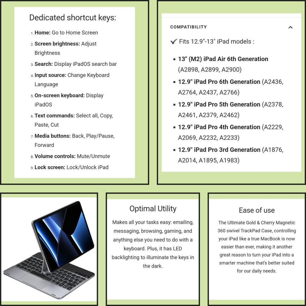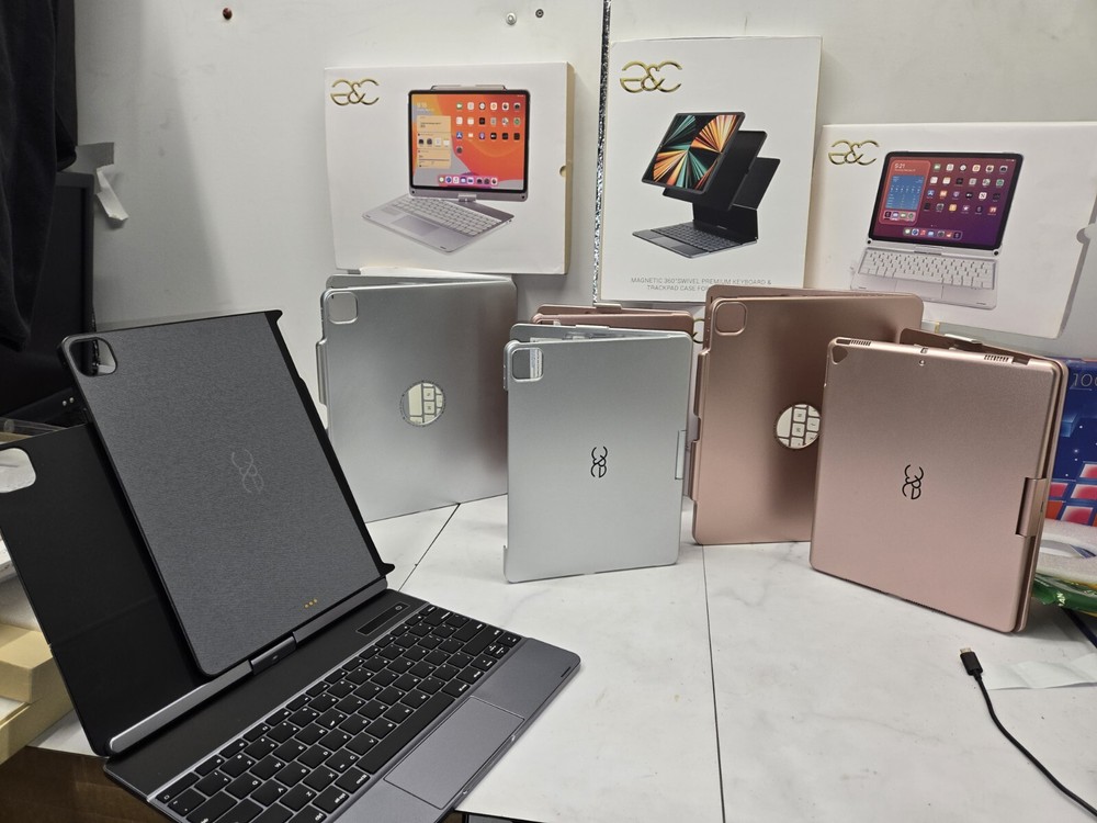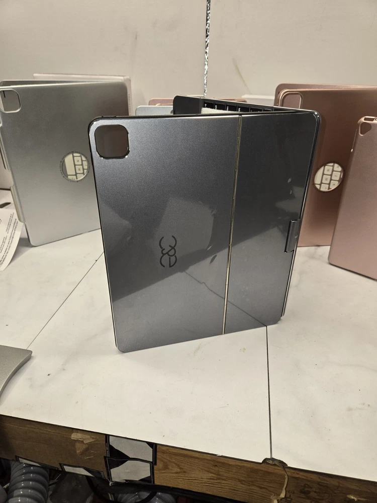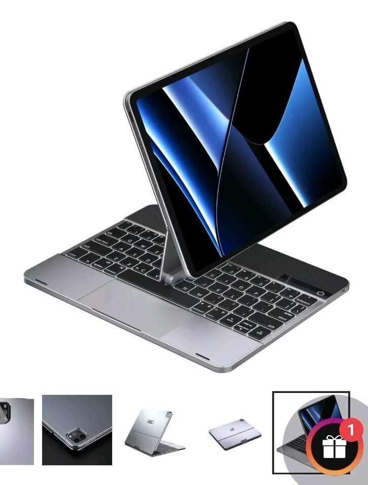 This 360° keyboard and trackpad case is the perfect accessory for your iPad Pro 12.9. It fits any 12.9-13 inch tablet and features a QWERTY (Standard) keyboard layout. The case is made of durable plastic and comes in a sleek pro gray color. It also comes with a wall charger and has built-in features such as a track ball, touchpad, multimedia integration, and enhanced function keys. The case is magnetic and has a built-in battery, quiet keys, and programmable one-touch buttons. It is foldable, portable, and has a plug & play feature. This case is ideal for anyone who wants to enhance their iPad Pro experience.