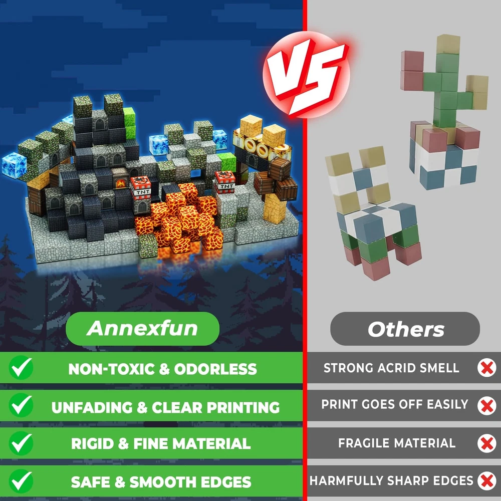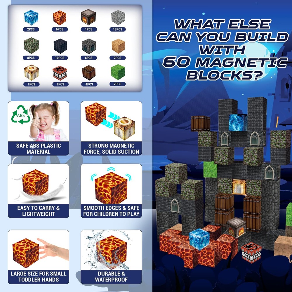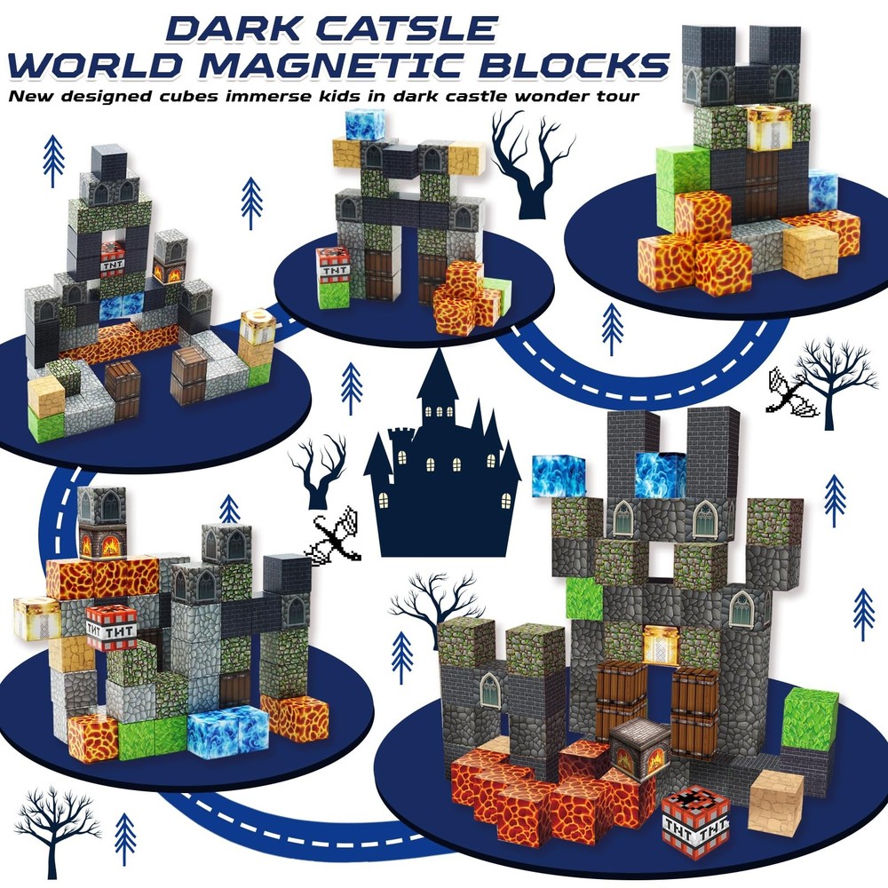 Magnetic Blocks - Build Magnetic Dark Castle Set - Magnetic Toys for Montessori Toddler Christmas Birthday Gifts - STEM Sensory Toys for 3 4 5 6 7 8 9 10 Year Old Boys & Girls 【Build Your Own Dark Castle 】Get ready to build a castle with this new magnetic cube set simulation "Dark Castle" Imagine the amazing stories that could happen in Dark Castle and start your castle adventure! Magnetic blocks allow your child to travel to a wonderful castles or a fantasy of possibilities! From simple to challenging builds, experience the fun of role-playing and dress-up toys! Let kids’ imaginations run wild with our magnetic open-ended playset! 【Dark Castle Magnetic Cube Kit】Including 60 magnetic cubes in 11 colors. Idea booklet with the storyline and beautiful patterns, keep them busy in clever ways. magnetic activity cubes are made of high-quality ABS material and crafted with the round edges and the right size. Unlike other magnetic toys on the market, our magnetic cubes kit with super strong internal magnetic, which is easier for toddlers ages 3+ to stick the cubes together and make builds sturdy. Perfect STEM toys help kids gain a deeper understanding of the structure and learn about magnetic properties! 【Sensory Education Toys for Toddlers】Magnetic building blocks offer an excellent way for kids to learn, play, and expand their self-confidence while understanding the construction better. Blocks also rustle like little bells while playing with it, which will attract toddlers' attention and delight them. Construction and building blocks toys unlock many skills for kids. With this magnetic tiles to build, spin, destroy, and rebuild, it helps to promote kids’ creative thinking, concentration and patience, hand-eye coordination motor skills, cooperative skills, and spatial and motor skills! 【STEM Learning Blocks】Attractive magnetic building blocks set is designed as preschool toys to guide to toddler's deeper understanding of the structure, keep them focus on the magnetic puzzle game, and confidence in their own ideas and imagination. Building blocks are fun and engaging, Bright colors will attract toddlers attention and make kids look forward to time away from screens. So even young children can imagine and create the buildings of their dreams. Recommended gifts toys for toddlers and kids ages 4-8! 【Best Gift for Kids-Giving Idea】It's a great fidget kids toys for classroom, toddlers, preschoolers, and teenagers, Which are popular with 3+ years old boys and girls. So even young children can imagine and create the buildings of their dreams. Kid will enjoy the fun of this magnetic tiles and learn by playing. Perfect educational gifts for birthdays, Christmas, Children's Day, STEM, and school activities. Make it the best option for parent-to-kid bonding play on weekends!