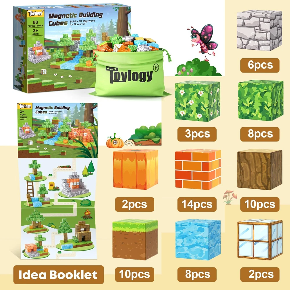 【BRING PUMPKIN MINE MAGNET WORLD TO LIFE】 Step into the thrilling pumpkin themed blocks of magnets! Construct a pumpkin fortress to protect kingdoms and battle monsters with role-play fun. Experience the endless construction possibilities of the pumpkin house, unleash a dream world of creativity. Toylogy blocks with 8 magnets, more stable, and flexible compared to other 6 magnets inferior blocks, and compatible with other 1IN blocks , also an expansion set that kids can add to expand your existing mine magnet world. 【KIDS GAMES MADE REAL】Combining the science of UV technology and magnetism which make your building arts more vivid and realistic than those of simple pure colored cubes, this magnetic blocks set offers a wealth of patterns. Pretend to grow pumpkins or harvest them or build your own pumpkin castle fortress, and add spooky decorations, defend kids’ castle from the witch dolls attacks. Ignite your kids' creative passion and enjoy hours of role-play fun! 【TODDLER LEARING GIRL BOY TOYS】Allow toddlers to successfully stick together, kids will not get frustrated by failed to build, and help kids gain a deeper understanding of the structure world and learn about magnetic properties. This magnetic blocks are sealed to keep the cubes from breaking. From building, destroying, to rebuilding, it allowing them to last for years. Recommended for toddlers and 3-8 years old children toy gift. 【STEM SENSORY & EDUCATIOANL TOYS】Creativity explodes when kids begin to play with well-designed building toys. Magnetic blocks are a must for your toy list. Encourage kid’s creativity, spatial awareness, and problem-solving skills. With vibrant colors and diverse design, magnetic blocks provides endless opportunities for young kids to explore and construct various structures. 【UNIQUE GIFTS FOR KIDS OF ALL AGES】Spark joy and imagination with our magnetic toys that bring endless fun and excitement. Whether it's for trick-or-treating, a Halloween party, or just everyday play and school activities, this magnetic toys is the ultimate building toys.Ideal for classroom,toddlers, preschoolers, teenagers, 3 4 5 6+ years old boys and girls. It is an eye-catching and festive gift to any Halloween-themed or Easter, birthdays, Christmas event.