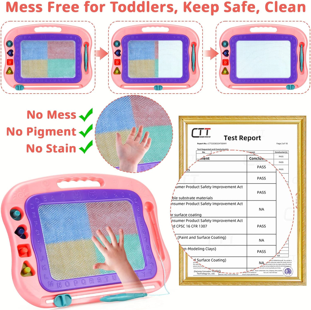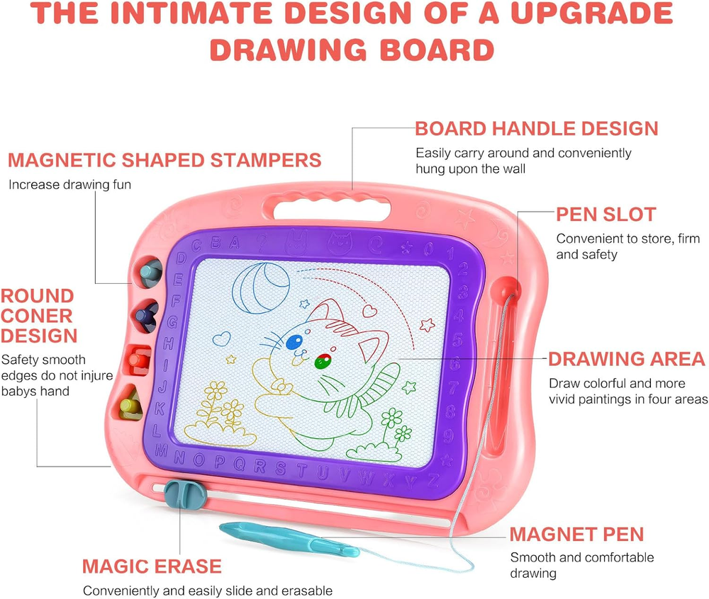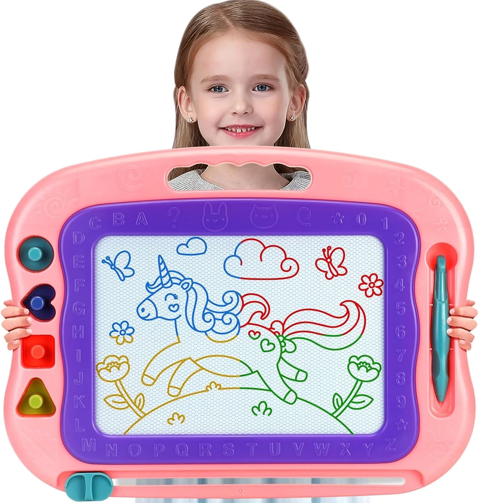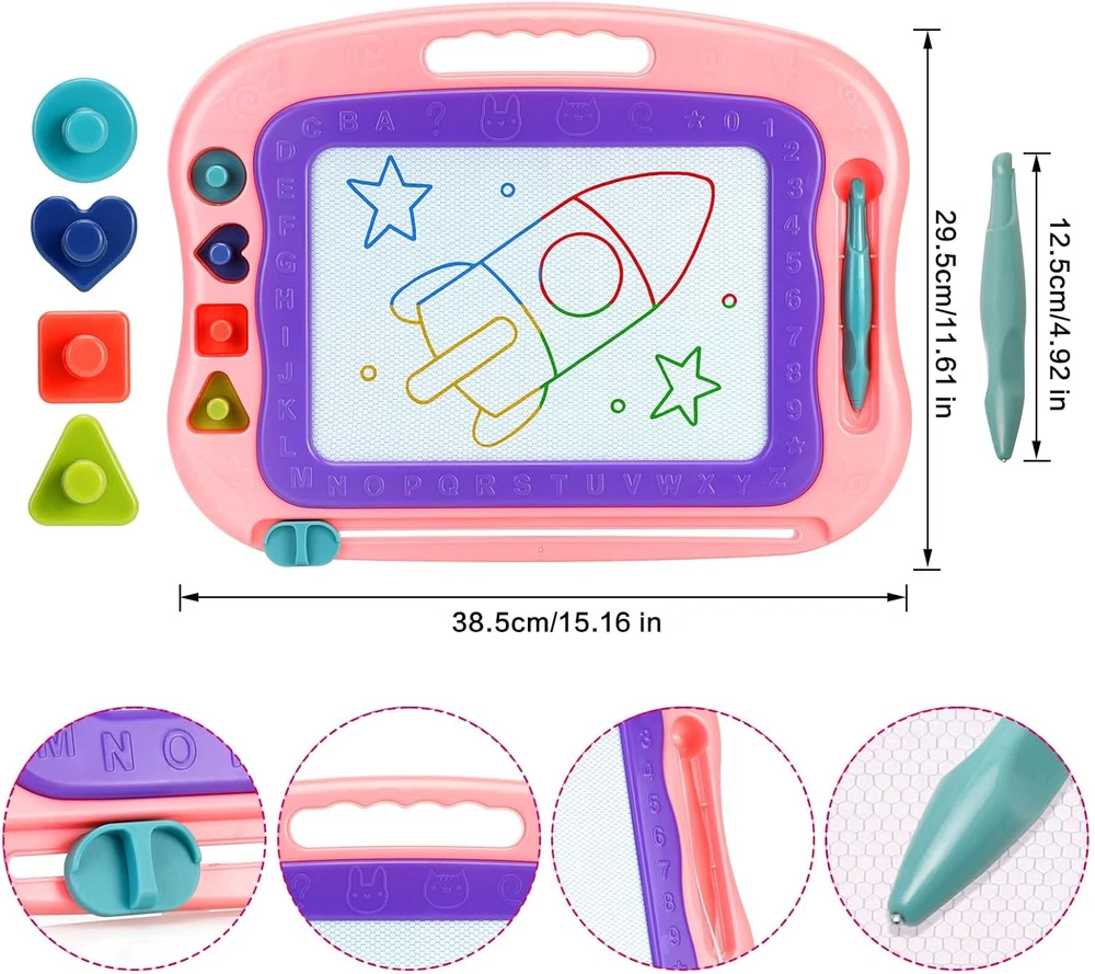 Toddler Toys for Girls- Large Magnetic drawing board for boys girls age of 3 4 5 6, smooth edges and the magnetic pen with a string, so kids won't lose it easily, multifunction educational learning toys for toddler girl toys. Perfect Easter gifts for kids Erasable Large Magnetic Drawing Board for Toddlers- Upgraded magnetic sketching pad with 4 colored zones green/blue/yellow/red, etch toddler colorful sketch, durable and smooth magnetic earser, can be earser easily, gift toys for toddler girls age 3 4 5 6 Durable Quality Material Kids Toys for Girls- Non-BPA material drawing board for toddlers, four different shaped stamps, large size suitable for playing at home and outdoor, multifunction magnetic drawing board for kids Suitable Size Magnetic Erasable Doodle Board for Kids Age 3 4 5 6 7- Frame dimensions: 15.16 X 11.61 inch, Drawing screen dimensions: 9.25 X 6.50 inch, with an easy-carry handle, 3 4 5 6 year old girls and boys can carry it everywhere by themselves Toddler Drawing Board Gifts Toys for 3 4 5 6 Year Old Girls Boys- The large sketching pad kid toys is lightweight and convenient, drawing board for kids ages 3-8 allows your kids to practice drawing and writing, exploring child's creativity, toddler girls toys gifts for Birthday, Easter Day, Christmas Day, New Year. Valentines day gifts for kids Product Description Large Magnetic Drawing Board - Start to be a little painter Drawing is Important for Child Wellchild magnetic drawing board, can improve child's development. Your child will have fun with magnetic drawing board and cultivate interest in drawing. Improves concentration Enhances self-expression Encourages imagination and creativity Develops your kid’s problem solving skills Improves sense of aesthetic and color combination Features : High quality material, BPA-Free PP Plastic, nontoxic, it is safe for child. Lightweight and portable, perfect toy for playing at home or outside for travel. With 4 stamps in different shapes of round, square, heart and triangle to decorate painting. Erasable and reusable drawing board, no more ink to stain your kid's clothes, face, no more mess to wall. Enjoying the Wonderful Drawing Time with Your Child Parent is Child's First Teacher Playing with kids builds a bond that will last forever. It lets the child know he or she is loved and appreciated. Drawing with your child together, nurture your child's artistic talents, you will enjoy the happy family time. Package Content: 1 X Magnetic Drawing Board 1 X Magnet Writing Pen 4 X Shaped Stamps Note: Choking hazard. Small parts, not for children under 3 years. Don't use other pens to draw the board or the image can't be erased and it will affect the performance of the board. Black dots may occur on screen in low temperature, can be removed by repeatedly drawing on it and erasing the screen multiple times in warmer temperature. Recommended Age: 3 years and up boys and girls A Fun Way to Develop Creativity and Writing Skills Encourage Imagination With large drawing area, your kid can draw and write whatever he/she dreams of. Multi-functional Toy Your kid can practice alphabet, solve simple math problem with the drawing board. Multicoloured Areas 4 color areas, green, yellow, red and blue, for more colorful and creative drawing. Thoughtful Design The pen attached by string so the pen would not drop, with a handle, easy to carry it to everywhere. A Nice Gift for Your Kids Large Magnetic Drawing Board Frame size: 15.16 X 11.61 inch Drawing area: 9.25 X 6.50 inch providing enough space for kids to draw, little painters are free to let go of their imagination and creativity. Great Early Educational Toy Happy drawing and learning Improves concentration Enhances self-expression Encourages imagination and creativity Perfect Gift for Your Kids Upgrade colorful magnetic drawing board, perfect early educational toy for your kid. Get it for your kid as a Birthday, Children's day, Christmas day gift or as a bonus. A great educational gift will make your kid smart.