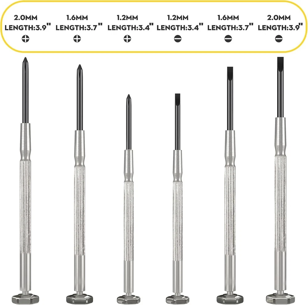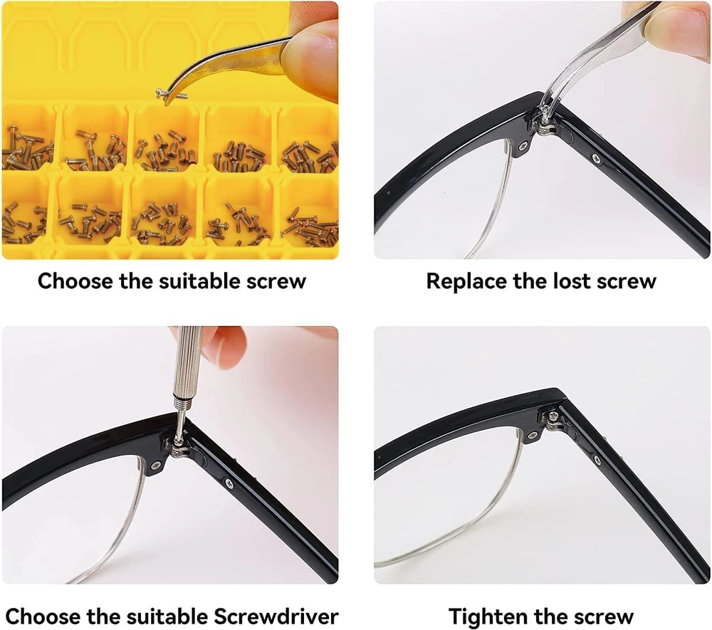 Magnetic Eyeglass Repair Kit, Glasses Repair Kit with Eyeglass Screws Include Nose Pads, Precision Screwdriver Tool Set and Tweezers for Eyeglasses, Sunglasses, Watch Clock Spectacle Repair 【Complete Eyeglasses Repair Kit】This repair kit includes all the eyeglasses screwdrivers, 4 size of eyeglass screws, 5 Pairs of Nose Pads, curved tweezer, cleaning cloth, screw caps for glasses repair. 【Magnetic Screws】These glasses screws are magnetic, and they are also not easy to rust, which is very suitable for glasses watches and so on. You can use the curved tweezers included in this kit to grab these small screws. 【Widely Application】The keychain screwdriver is suitable for many kinds of work and maintenance in our lives. It can be used to repair watches, glasses, mobile s, and small electrical equipment with screws. 【Keychain Screwdriver】The keychain screwdriver includes phillips flat tip screwdriver. It is a professional tool for repairing glasses, and you can also attach it to your key chain for standy applications. 【Warm notice】Please check the measurements of each item before purchasing our product to ensure the size of pieces in the repair kit matches your eyeglass.