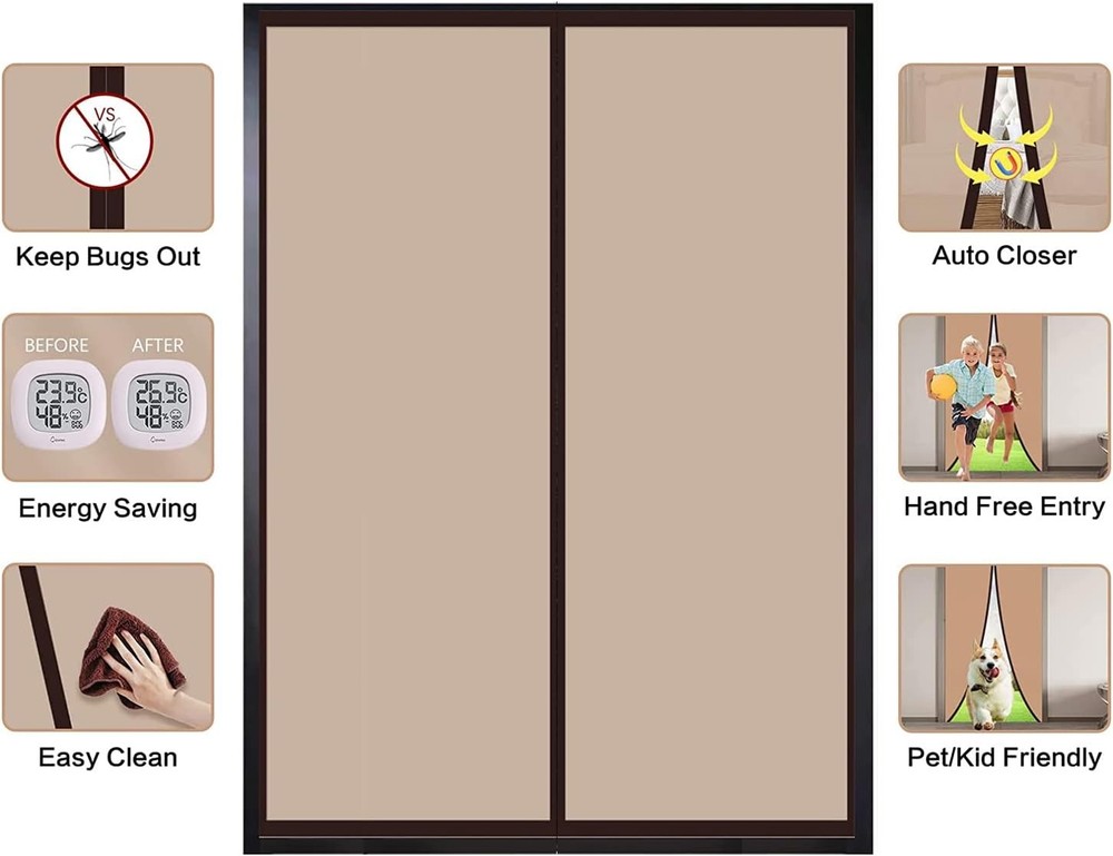 Magnetic Insulated Door Curtain, Fit Doors Size Up to 60" x 80", Coffee Product Details Brand: Veanusiver Color: Coffee Material: Eva Style: Thermal Item Weight: 2.14 Pounds Assembly Required: No Manufacturer: Veanusiver Item Weight: 2.14 pounds Product Dimensions: 0.2 x 60 x 80 inches Size: Fit Doors Size Up to 60" x 80" Batteries Included?: No Batteries Required?: No Brand: Veanusiver Color: Coffee Material: Eva Style: Thermal Item Weight: 2.14 Pounds 【Wide Range of Applications】 The EVA Insulated Door Curtain is 61.8 x 81.5 inches, which can be suitable for doors up to 60 X 80 inches. The doorway curtain is a great companion for air-conditioned rooms, which can prevent warm air loss in winter and keep the cold wind from entering, stop the cold air-conditioning escaping of your room in summer and keep hot air out. To achieve the purpose of saving energy and electricity, make you feel warm in winter or cool in summer. 【Full Frame Magic Tape Design】Veanusiver's Hands-Free Closure insulated door cover adopts the high-density and strongest materials. They are smooth and durable, non-odorous, easy to clean, and very safe for homes and pets. Good sealing performance keep the cold or heat out.It is also particularly suitable for the kitchen, which can prevent cooking odors from spreading in other rooms. 【Quality Assurance】The middle seam of the coffee screen doors with magnets is strategically lined with 19 powerful magnetic cubes that allow the door to open easily and close seamlessly! Made of EVA environmental microlight transmission thicknessmaterial, soft, durable, scratch - resistant, and washable. 【Easy to Install】 The doorway curtain is easy to install. No tools required, simply peel the adhesive backing off, apply for door frame. Our screen curtain uses the full frame Magic Tape design. Comes with a roll of magic tape to avoid dropping and enable you to remove the door screen any time,package included extra push pins to secure the screen into its place much more stable. 【Multi-Function】The temporary screen door can be used in many places, Thermal insulated door curtain is the best companion to air-conditioned room. Thickened materials reduce outside noise,provide you a quiet and private space! Can be used as a temporary door and suitable for main entrance doors, offices, stores, patio, deck, porch, balcony, glass, garage, sliding doors. Specification: Product Name: Insulated Door Curtain Screen Size: 61.8 x 81.5 Inch Fit Your Door Size: Up To 60 x 80 Inch Material: EVA Eco-Friendly Material Color: Coffee Package Includes: 1 x Insulated Door Curtain 1 x Roll of Magic Tape 1 x Pack of push pins 1 x Instruction
