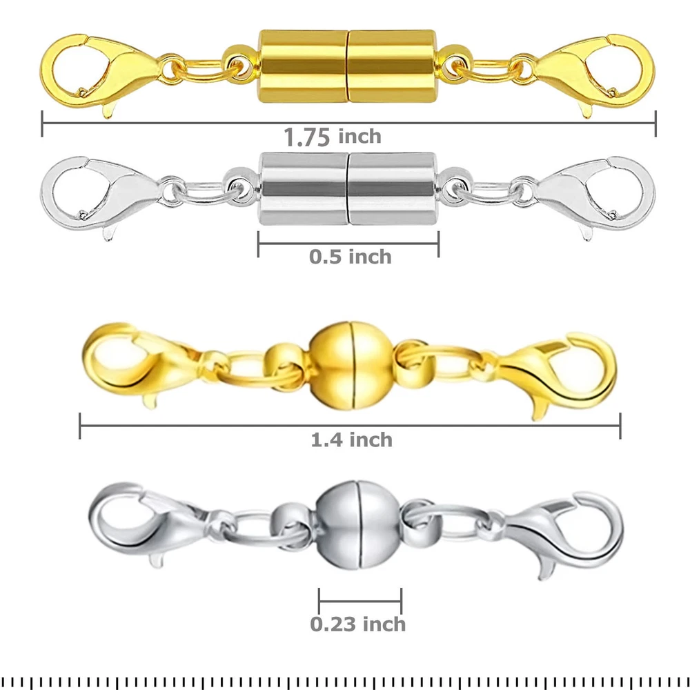 Magnetic Lobster Claw Lock Clasps DIY Necklace Bracelet Jewelry Hook Extender Features Strong magnetic latch, effortless to connect most jewelry clasps with one hand. Both sides with lobster clasp, easy to install and disassemble. Made with premium brass with gold and silver tone plating, long lasting, and comfortable to wear. Silver and gold lobster clasp, can match your diverse styles of jewelry. DIY friendly. Simply clip both end of the lobster clasps to your jewelry piece, the magnetic latch will connect and stay on firmly, easy to install and disassemble. Specifications Color: Gold, Silver Material: Brass Length: 1.75" (Cylindrical), 1.4" (Spherical) Items Included Gold and Silver Magnetic Lobster Clasps (Pick your style and quantity) Payment Shipping Returns About Us Payment Shipping Returns About Us We accept PayPal, major credit cards, and other methods supported by eBay Managed Payments. We offer FREE shipping on all orders! Your order will be dispatched within 24 hours receiving payment and you should expect to receive it two to five days after dispatch. If you are not completely satisfied within 30-days of your purchase, you can return the product and get a full refund or replacement (your choice). Our return process is eBay managed and very easy to follow. We will be responsible for the return shipping cost of the damaged or wrong items. We are a family owned business located in the beautiful western Pennsylvania. We began as a wholesale jewelry and fashion importer. After successfully selling a few precison jewelry scales on a major online marketplace in 2009, we decided to transform into a professional weight scale distributor. Then soon expanded into other great product categories. See our other items Features ---Strong magnetic latch, effortless to connect most jewelry clasps with one hand. ---Both sides with lobster clasp, easy to install and disassemble. ---Made with premium brass with gold and silver tone plating, long lasting, and comfortable to wear. ---Silver and gold lobster clasp, can match your diverse styles of jewelry. ---DIY friendly. Simply clip both end of the lobster clasps to your jewelry piece, the magnetic latch will connect and stay on firmly, easy to install and disassemble. Specifications ---Color: Gold, Silver ---Material: Brass ---Length: 1.75" (Cylindrical), 1.4" (Spherical) Items Included ---Gold and Silver Magnetic Lobster Clasps (Pick your style and quantity) Magnetic Lobster Claw Lock Clasps DIY Necklace Bracelet Jewelry Hook Extender Features Strong magnetic latch, effortless to connect most jewelry clasps with one hand. Both sides with lobster clasp, easy to install and disassemble. Made with premium brass with gold and silver tone plating, long lasting, and comfortable to wear. Silver and gold lobster clasp, can match your diverse styles of jewelry. DIY friendly. Simply clip both end of the lobster clasps to your jewelry piece, the magnetic latch will connect and stay on firmly, easy to install and disassemble. Specifications Color: Gold, Silver Material: Brass Length: 1.75" (Cylindrical), 1.4" (Spherical) Items Included Gold and Silver Magnetic Lobster Clasps (Pick your style and quantity) Payment We accept PayPal, major credit cards, and other methods supported by eBay Managed Payments. Shipping We offer FREE shipping on all orders! Your order will be dispatched within 24 hours receiving payment and you should expect to receive it two to five days after dispatch. Returns If you are not completely satisfied within 30-days of your purchase, you can return the product and get a full refund or replacement (your choice). Our return process is eBay managed and very easy to follow. We will be responsible for the return shipping cost of the damaged or wrong items. About Us We are a family owned business located in the beautiful western Pennsylvania. We began as a wholesale jewelry and fashion importer. After successfully selling a few precison jewelry scales on a major online marketplace in 2009, we decided to transform into a professional weight scale distributor. Then soon expanded into other great product categories. See our other items Features Strong magnetic latch, effortless to connect most jewelry clasps with one hand. Both sides with lobster clasp, easy to install and disassemble. Made with premium brass with gold and silver tone plating, long lasting, and comfortable to wear. Silver and gold lobster clasp, can match your diverse styles of jewelry. DIY friendly. Simply clip both end of the lobster clasps to your jewelry piece, the magnetic latch will connect and stay on firmly, easy to install and disassemble. Specifications Color: Gold, Silver Material: Brass Length: 1.75" (Cylindrical), 1.4" (Spherical) Items Included Gold and Silver Magnetic Lobster Clasps (Pick your style and quantity)