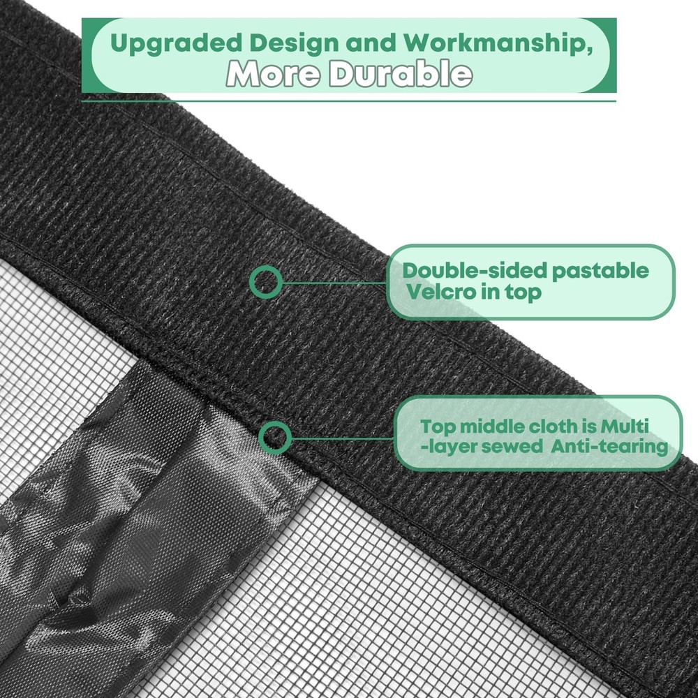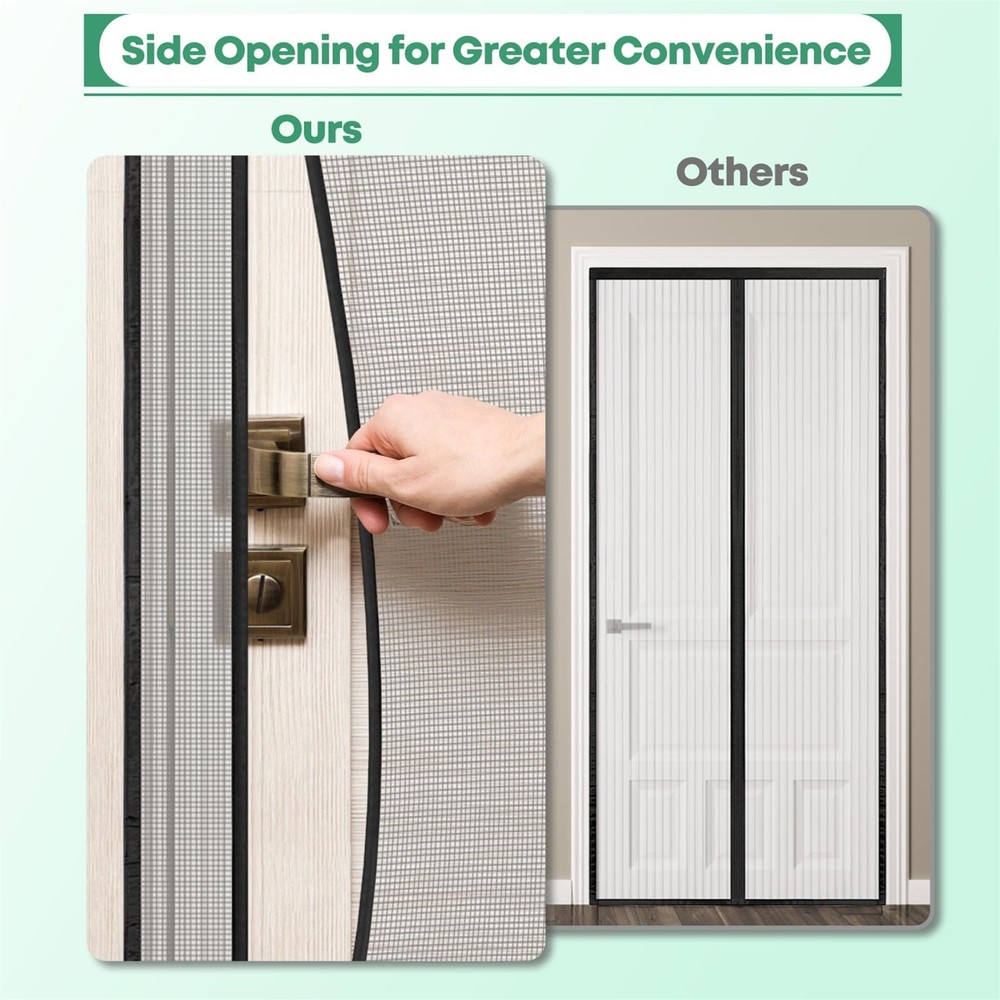 【Innovative Side Opening Design】 Unlike traditional center-split doors, our magnetic screen door features left/right side openings for flexible placement around door handles or furniture. Enjoy unobstructed views and effortless access, adapting seamlessly to your space layout with adjustable hook-and-loop tape 【Premium Durable Construction】 Upgraded with tear-resistant mesh and heatproof adhesive velcro for long-lasting use. Magnets are quietly cloth-wrapped to ensure noise-free closure, perfect for homes with kids, pets, or frequent use 【1-Minute Drill-Free Installation】 No tools, no damage! Install or remove in seconds using strong adhesive strips. Ideal for renters and all door types. Auto-closing design keeps bugs out while letting pets/kids pass freely 【Perfect Fit for Standard Doors】 40"W x 84"H screen with extended velcro edges fits doors up to 38"W x 82"H. The left and right side velcro is 1 inch wide, and the top velcro is 1.5 inches wide. Package includes screen, bonus velcro roll, push pins, and visual guide 【Smart & Pet-Friendly Functionality】 The strong magnetic seal snaps shut instantly, blocking insects yet allowing easy entry. Lightweight mesh ensures smooth operation, designed for high-traffic households