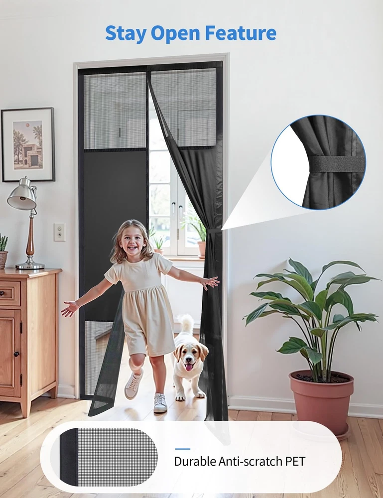 Upgrade your home with our Privacy Magnetic Screen Door, a perfect blend of insect protection, privacy, and ventilation. Unlike traditional screen door mesh, this design features fiberglass mesh on the top and bottom for airflow, while the center section is made of blackout fabric, ensuring enhanced privacy for your home. Whether you need a magnetic screen door for your bedroom, balcony, or patio, this durable fiberglass screen offers a pet-friendly, hands-free solution with a self-closing magnetic seal. Key Features: β Privacy & Protection β Designed for those who want to enjoy fresh air while keeping bugs out and preventing outsiders from peeking in. The blackout fabric center panel ensures full privacy while the breathable fiberglass mesh allows air circulation. πͺ Hands-Free Magnetic Closure β Strong built-in magnets ensure automatic closing after you pass through, making it perfect for kids, pets, and busy households. Say goodbye to constantly opening and closing the door! πΎ Pet-Resistant & Durable Fiberglass Mesh β Crafted from heavy-duty fiberglass, this privacy screen door is scratch-resistant, tear-resistant, and long-lasting, providing superior durability compared to polyester mesh. π Multiple Sizes Available β We offer 5 different sizes to fit standard doors: β Fits 32"x80" doors (Screen size: 34"x81") β Fits 36"x80" doors (Screen size: 38"x81") β Fits 36"x82" doors (Screen size: 38"x83") β Fits 60"x80" doors (Screen size: 62"x81") β Fits 72"x80" doors (Screen size: 74"x81") π§ Easy Installation β Comes with a strong adhesive tape and push pins for added stability. No tools required! Simply attach the screen door in minutes for a secure and seamless fit. Upgrade your home with a Privacy Magnetic Screen Door todayβenjoy fresh air, protect your privacy, and keep insects out effortlessly! Magnetic Screen Door Size: Screen door size: 38 x 81 inch, Fit Door Size: 36 x 80 inch. Great for some front doors, patio doors, and balcony doors. Before purchase, please carefully measure your door size (not include door frame part ) and order the Fit Door Size accordingly. Privacy & Protection in One: Designed with a unique combination of fiberglass mesh on the top and bottom for airflow and a blackout fabric in the middle for enhanced privacy. This privacy screen door keeps bugs out while preventing unwanted views from outside. Hands-Free Entry & Auto Close: The magnetic screen door features a strong self-sealing magnetic closure, allowing hands-free access for kids and pets. The automatic closure ensures a tight seal, keeping your home insect-free. Heavy-Duty & Pet-Friendly: Made of reinforced fiberglass mesh, this screen door mesh is more durable than standard polyester screens, offering superior resistance to wear and pet scratches. Perfect for busy households. Easy & Secure Installation: No tools required! This screen door comes with strong adhesive tape and push pins for extra stability. Simple to install and remove, making it a hassle-free addition to any front door, patio, balcony, or sliding door.