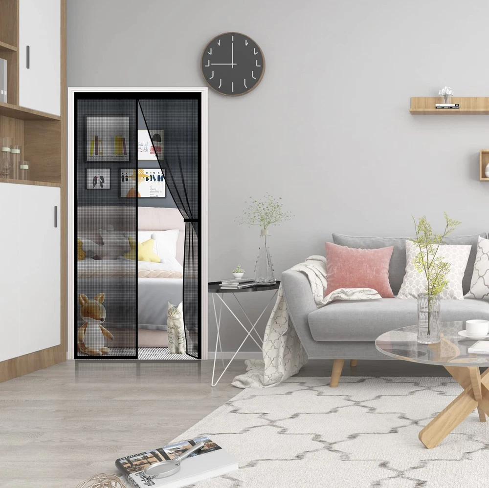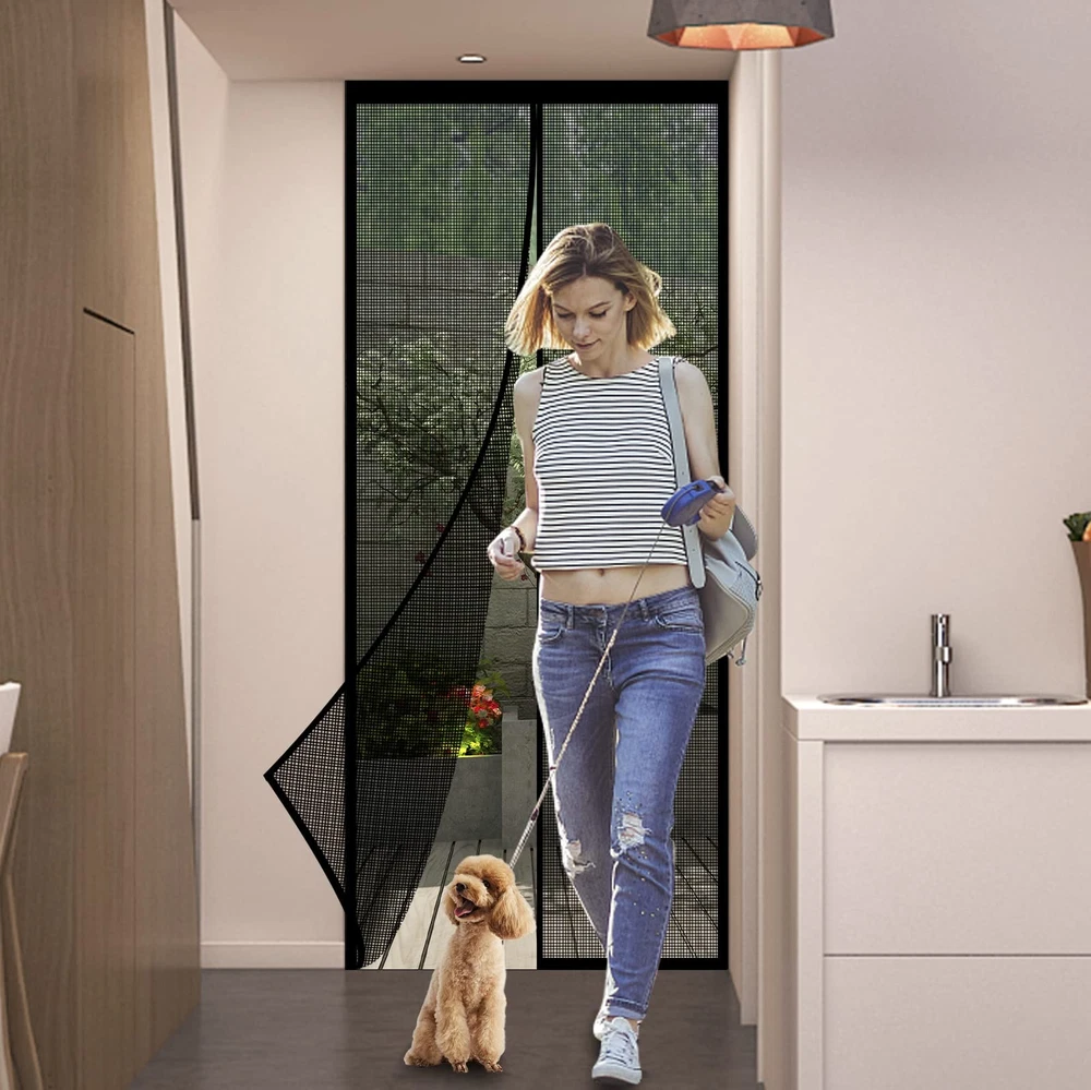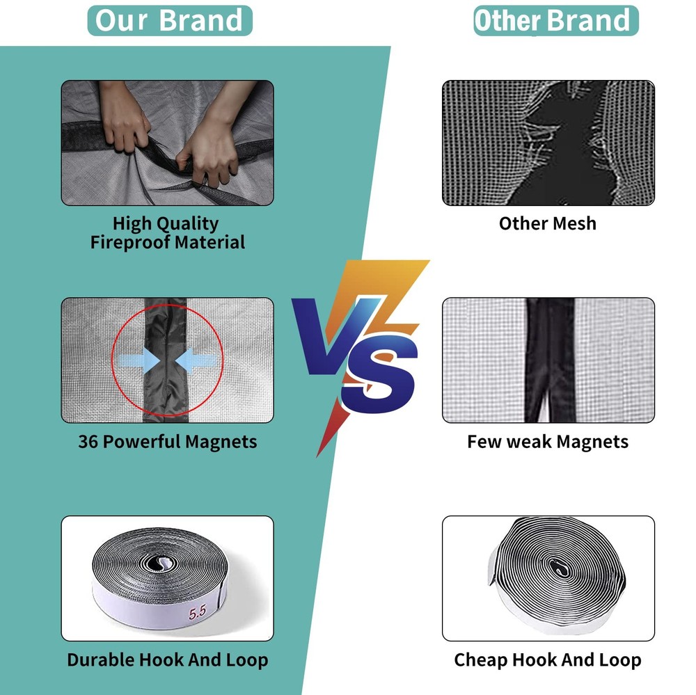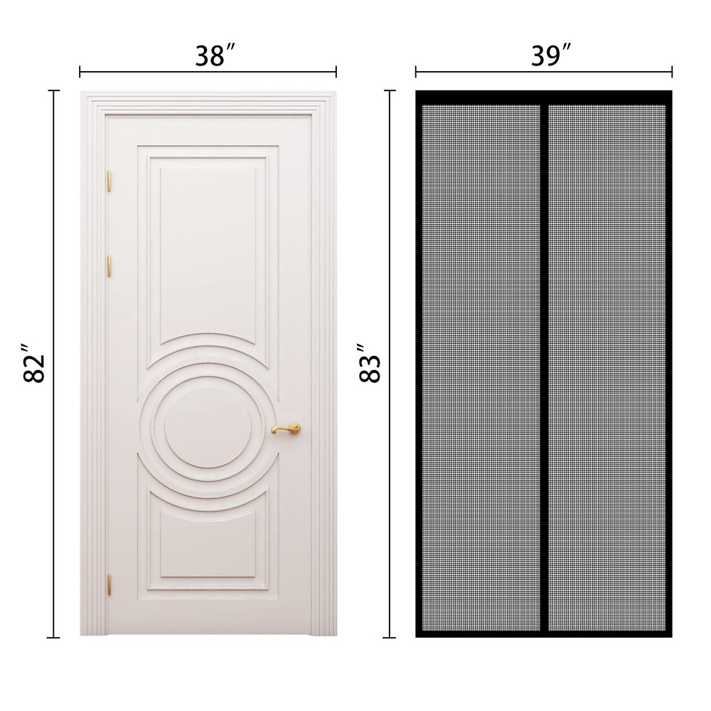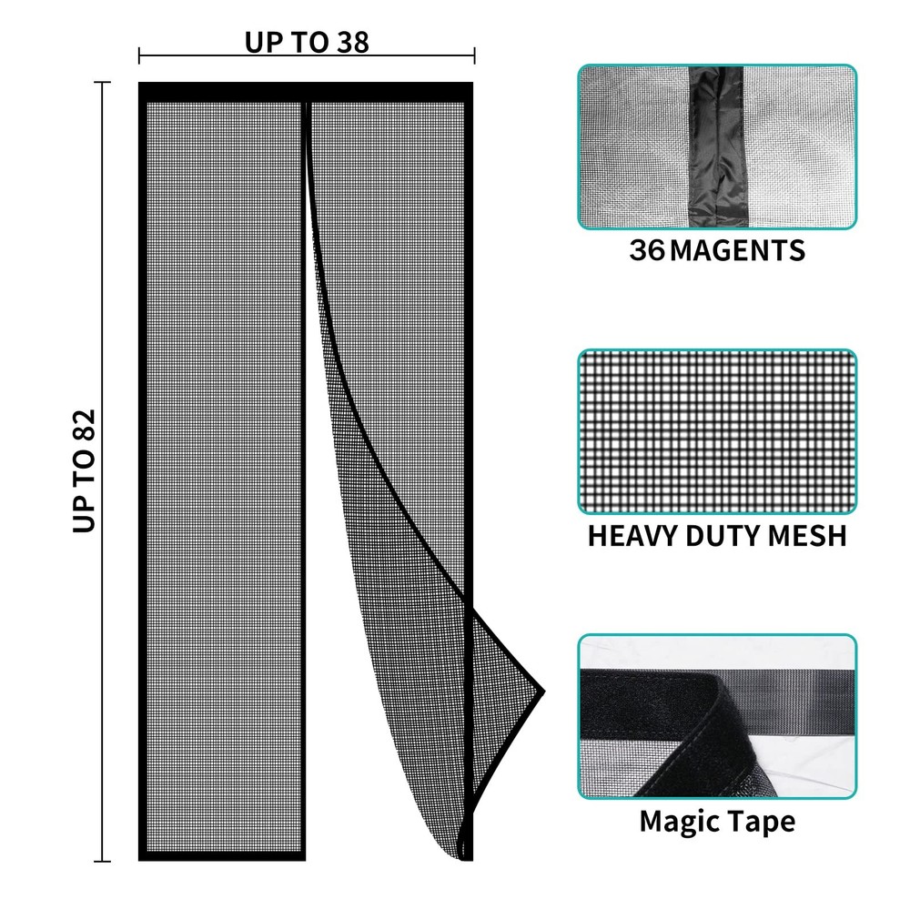 Suitable for various kinds of door: storm door, rv door, entry door, front door, back door, sliding door, patio door, balcony backyard door, single door, double door, french door, home kitchen door, bedroom door, sitting room door, wooden door, glass door, aluminum door etc. 1.More Stronger: Increased strength will lenghten the life of your screen door and help prevent holes and tears. 2.Fireproof: Improved flame resistance will be very safe.Traditional polyester screen can ignite melt and flammable. 3.Closer Sealing Durable Fiberglass mesh material with magnets and magnetic seals, close door more quickly, quieter and closer. 4.Light Transmittance: Allows more UV light passing than polyester screen to bring more natural light in your home. 5.Improved Airflow: There is a dramatic difference in airflow between fiberglass than cheaper polyester door screen. Specifications: Name: Fiberglass Magnetic Screen Door Color: Black Fit Door Size: 38 x 82 Inches Magnetic Screen Door Size: 39.4 x 83.5 inch Package Include: A screen door; A roll of hook tape; A box of pushpins; An instruction. Note: Before purchasing, please carefully measure your door size and order that size. 【Magnetic Door Curtain Size】The actual size of this magnetic door curtain black is 39.4" width x 83.5" height, and it FITS door size up to 38 x 82 Inches. the curtain is stuck on the door frame,Please measure your doors before ordering!Designed with magnets and magnetic seals,the door mesh curtain hands free closes more quickly,quieter and closer. 【Reinforced Durable Fiberglass Material】Compared to the previous nylon or polyester screen mesh,premium fiberglass material is more stronger and durable,through high temperature molding so that is fireproof.The magnetic screen door is chemical corrosion resistance,anti-tear and high-density can be reused many times.In addition,fiberglass door curtain has a better transmittance than traditional polyester screens,bring you better vision experience. 【Automatic Closed and Hands Free】Built-in strong powerful magnetic and extra gravity sticks allow your little kids and pets walking through friendly,Hands Free,36pcs sewed in strong magnetic points make the screen door mesh curtain more closer and stable, which is used to consolidate and prevent from being blown away by the wind. 【Easy to Install】No tools required, simply peel the adhesive backing off the hook and loop strips and apply to door frame. The screen curtain uses the full frame Magic Tape design which enables you to remove the mesh curtain anytime, to make sure the screen into its place much more stable, extra push pins are provided. 【Full Frame Hook and Loop Tape Design】The durable fiberglass mesh is more small than old polyester mesh,has better light transmittance,allows more fresh air and sunshine passing than polyester screen.The screen curtain use the loop tape design,reinforced tape along every inch,which enable you to remove the mesh curtain anytime,so you could fold for off-season storage.